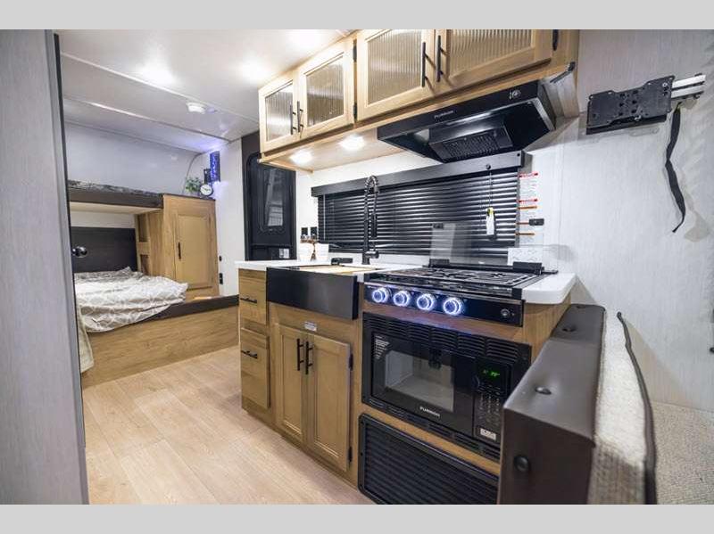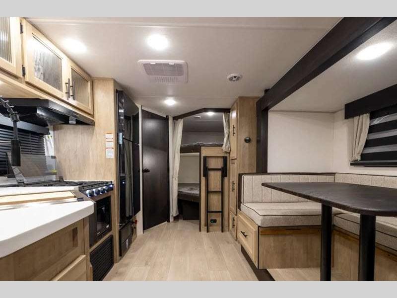 Sleeps 9 Slides 1 Length 23 ft 9 in Ext Width 8 ft Ext Height 10 ft 6 in Int Height 0 ft Hitch Weight 760 lbs GVWR 7760 lbs Dry Weight 6573 lbs Cargo Capacity 1187 lbs Fresh Water Capacity 52 gals Grey Water Capacity 38 gals Black Water Capacity 38 gals Furnace BTU 20000 btu Number Of Bunks 2 Available Beds RV King Refrigerator Type 12V Cooktop Burners 3 Number of Awnings 1 Water Heater Type Tankless AC BTU 15000 btu Cargo Deck Size 0 ft Awning Info 15' Full Length Power w/LED Light Strip Axle Count 2 Shower Type Tub/Shower Combo Solar Wattage 200 watts Similar Floorplans