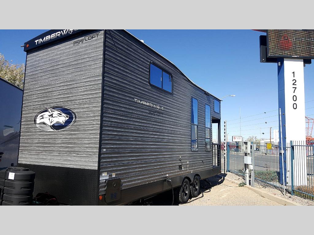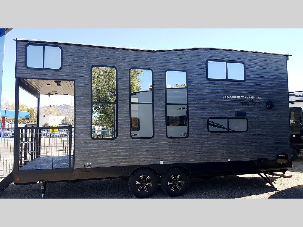 You will fall in love with this mini-loft Timberwolf that will feel more like a tiny home. There are steps leading up to the loft with a queen bed, cabinets, and even a fireplace! The kitchen includes a cooktop and a microwave oven to prepare meals, plus an 11 cu. ft. 12V residential refrigerator with Travel Lock. You'll enjoy relaxing on the 58" sofa, dining at the high top table, or reading a book on the lounge chair. There is also a rear deck with patio doors where you can spend your evenings together, and there is even a second loft above the deck for added sleeping or storage space!