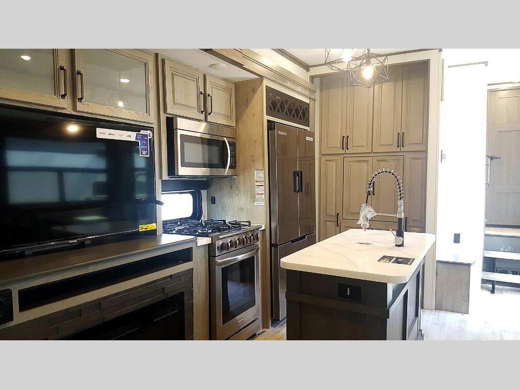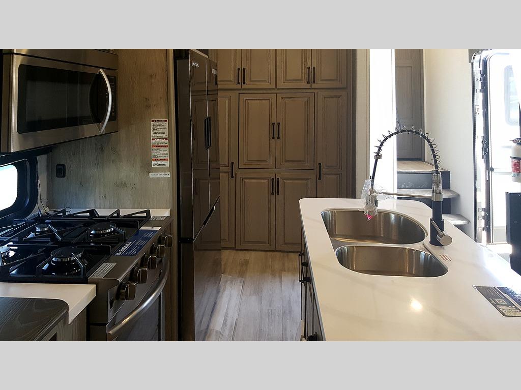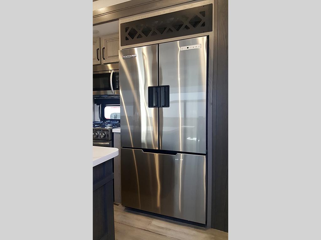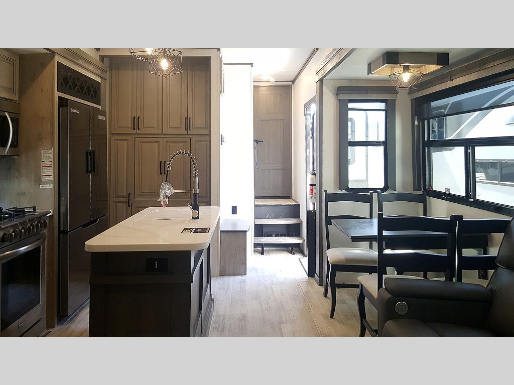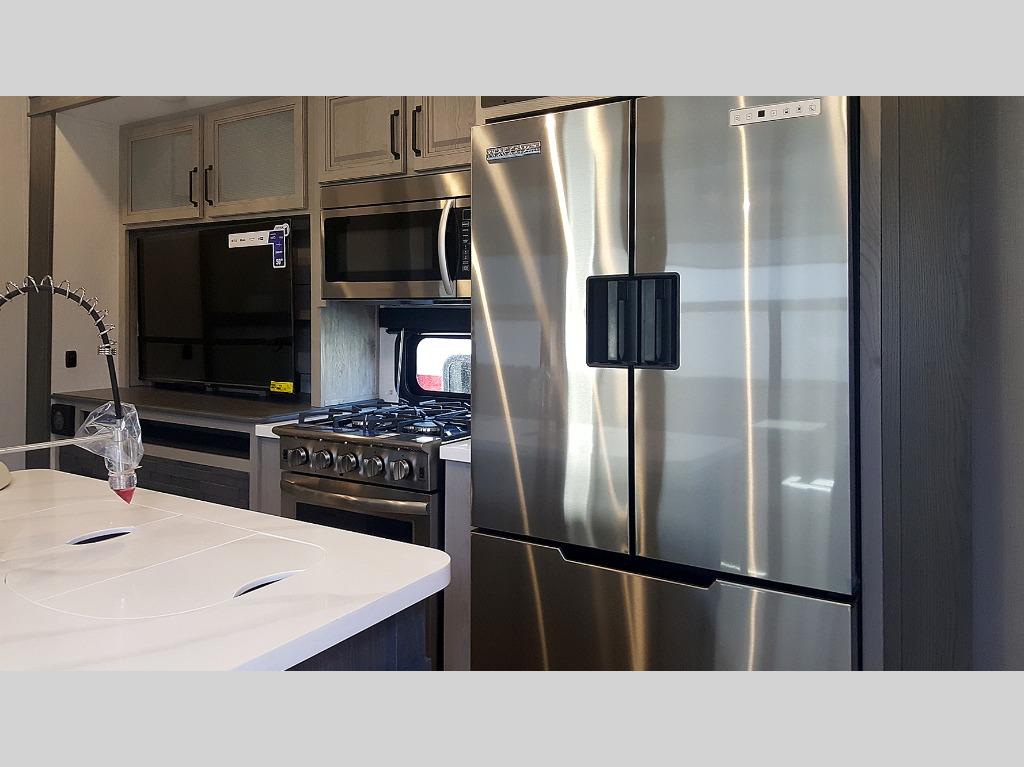 Get ready for family fun in this fifth wheel offering a front master bedroom with a king-size bed slide, plus a second master bedroom for your guests! The second bedroom includes a queen-size bed slide and a spacious rear full bathroom with a private entry/exit. The open concept main living and kitchen area offers dual opposing slides which includes theater seating, a free standing dinette, a fireplace, a center island and walk-in pantry. These full kitchen amenities are sure to make meal prep and cooking easy, especially with a convection microwave, Insignia kitchen appliances, and an 18 cu. ft. residential refrigerator with an ice maker.