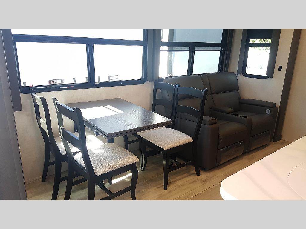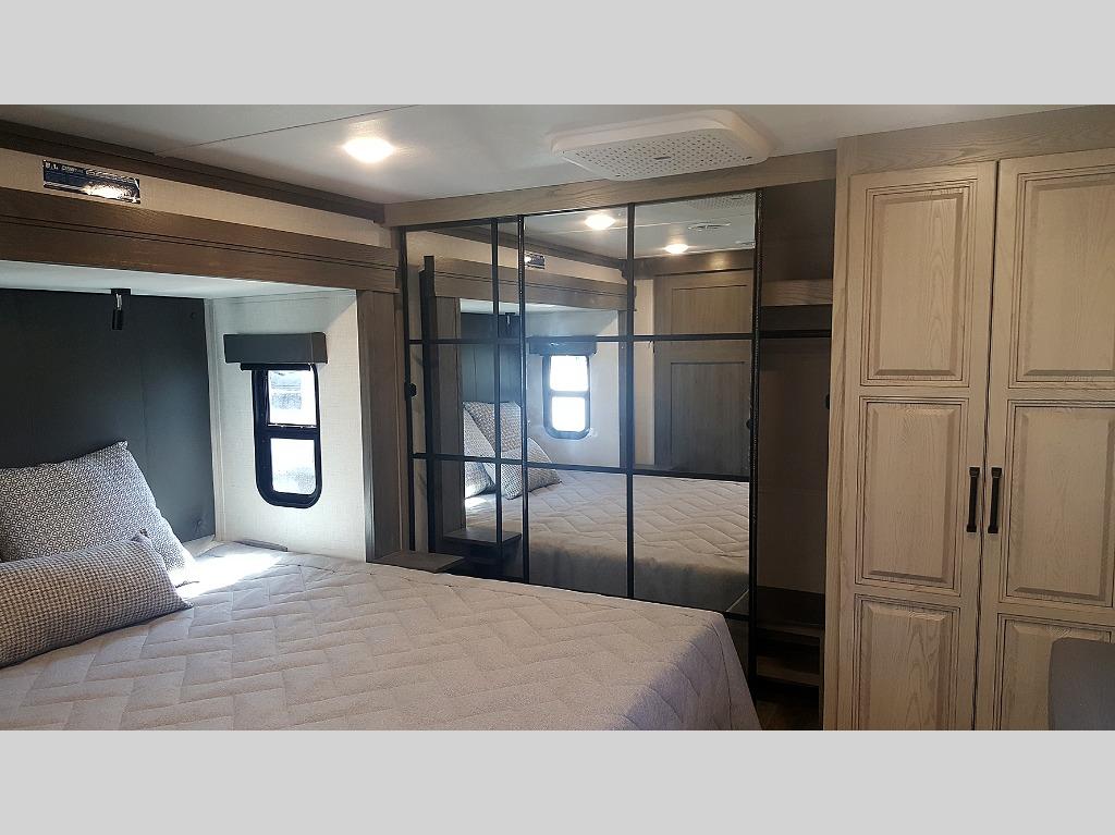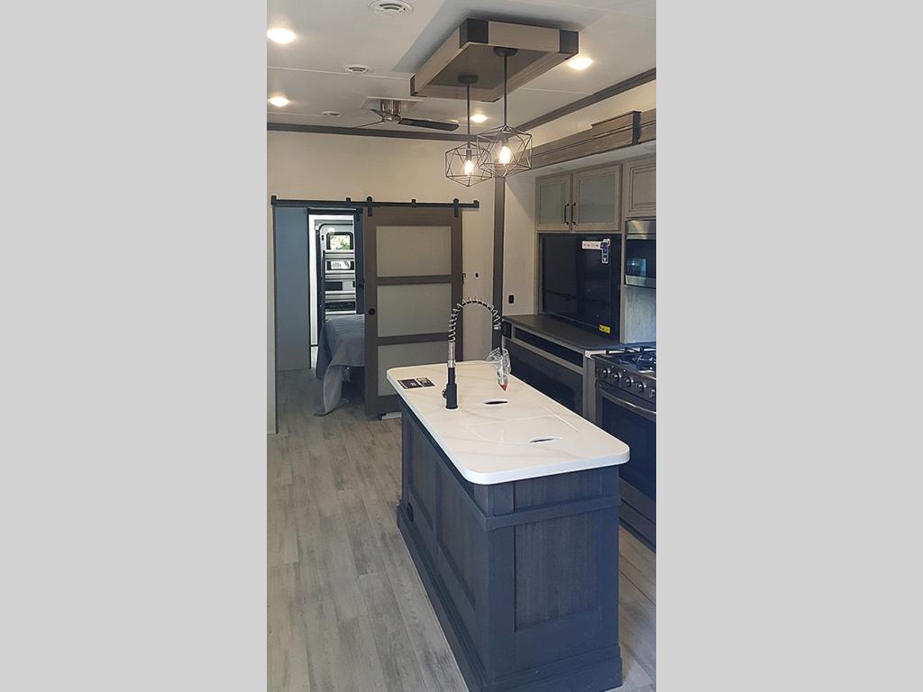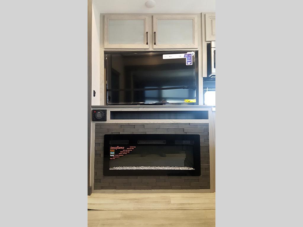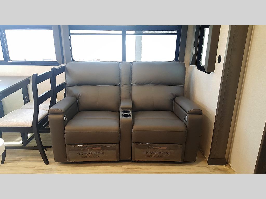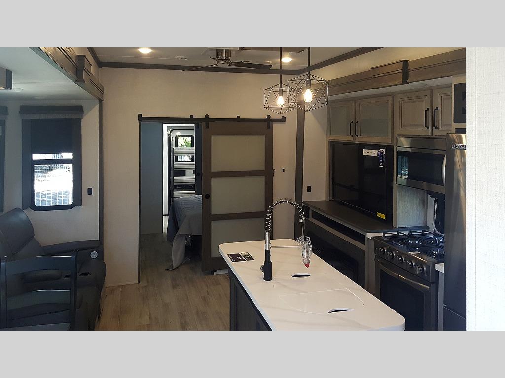 Get ready for family fun in this fifth wheel offering a front master bedroom with a king-size bed slide, plus a second master bedroom for your guests! The second bedroom includes a queen-size bed slide and a spacious rear full bathroom with a private entry/exit. The open concept main living and kitchen area offers dual opposing slides which includes theater seating, a free standing dinette, a fireplace, a center island and walk-in pantry. These full kitchen amenities are sure to make meal prep and cooking easy, especially with a convection microwave, Insignia kitchen appliances, and an 18 cu. ft. residential refrigerator with an ice maker.