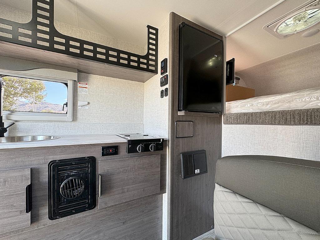 With any Squire Truck Camper by Lance, you will enjoy superior quality with a great value! They are constructed with aluminum framed walls, block foam insulation, and Azdel interior walls for added durability. There is Euro-ply cabinet construction inside, along with Surf-X suedo solid surface lightweight countertops, overhead Molle panel storage space, and 12V/USB charging ports in the dinette and cab-over areas for your electronics. To further customize your truck camper, consider adding the optional air conditioner, backup camera, electric side awning, and more available options!