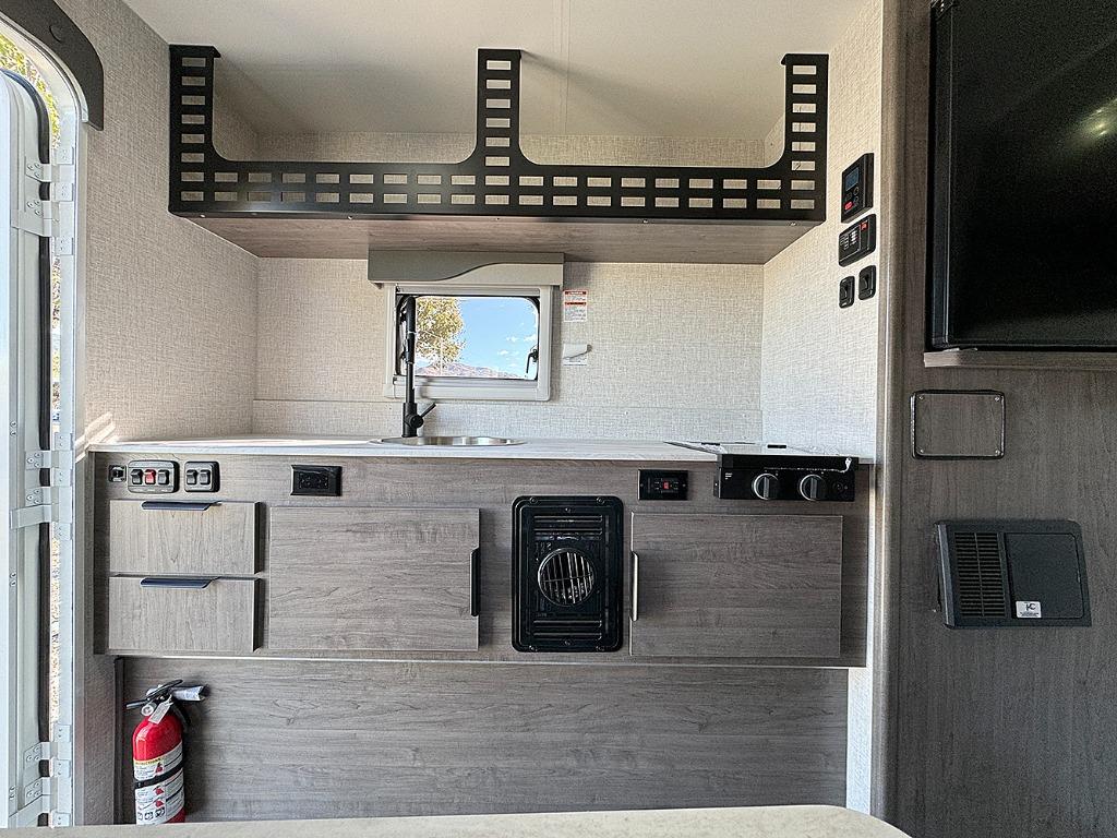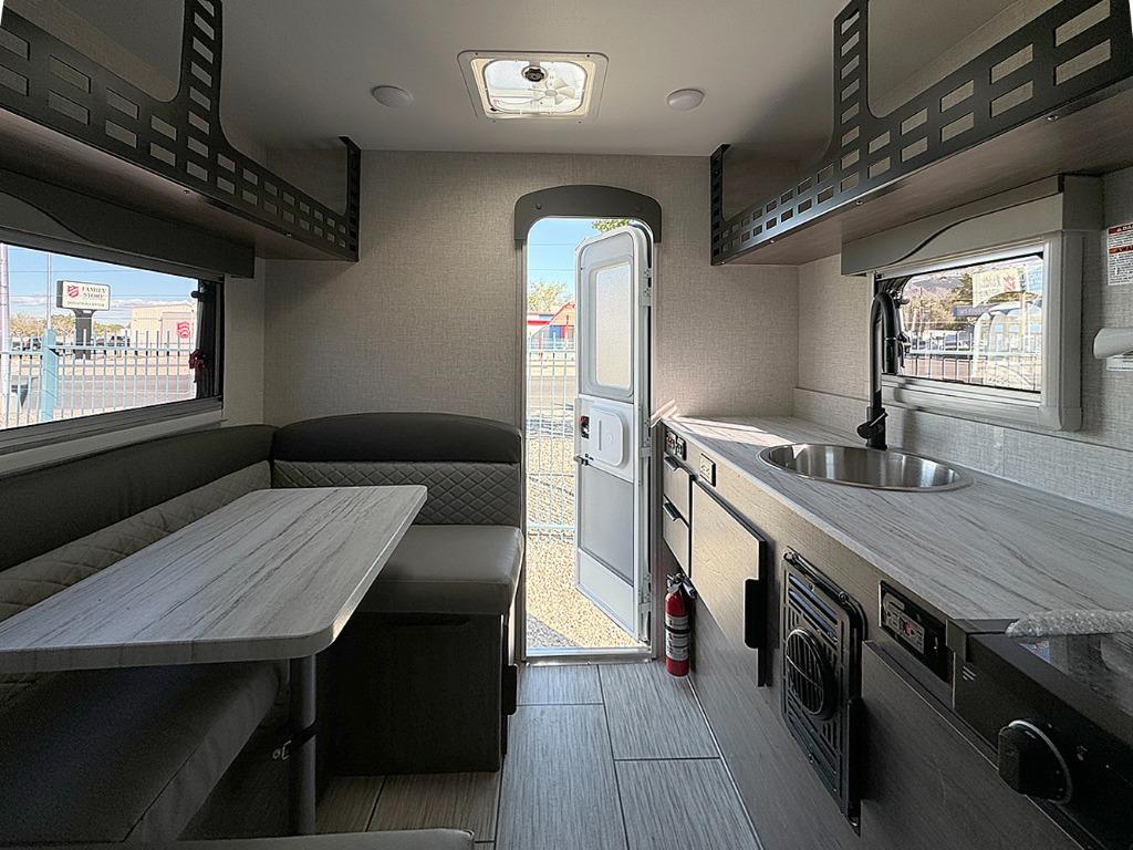 Simple camping has never been easier than with this truck camper! Once you've set up camp for the night, you can make dinner on the two burner cooktop, freshen up with the high spout galley faucet, and store leftovers in the 3.3 cu. ft. 12V refrigerator. You will also appreciate the ample counter space here! The U-shaped dinette will provide a place to dine together and even let a guest or two stay over. A Porta-Potti comes standard so you don't have to leave your camper in the middle of the night, and you can choose to add the optional exterior zero shower that provides an enclosure for your exterior wash station!