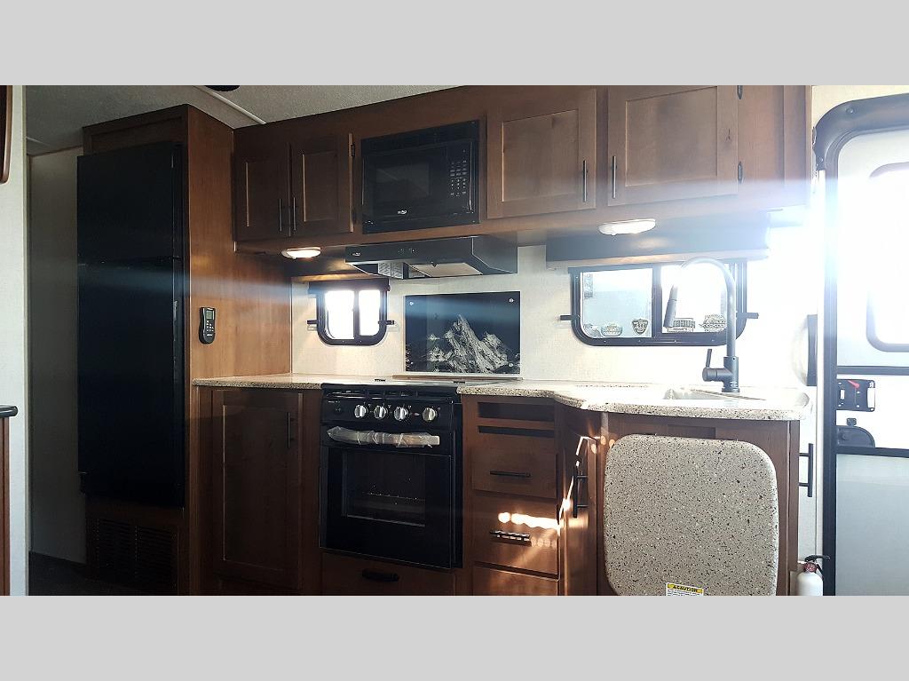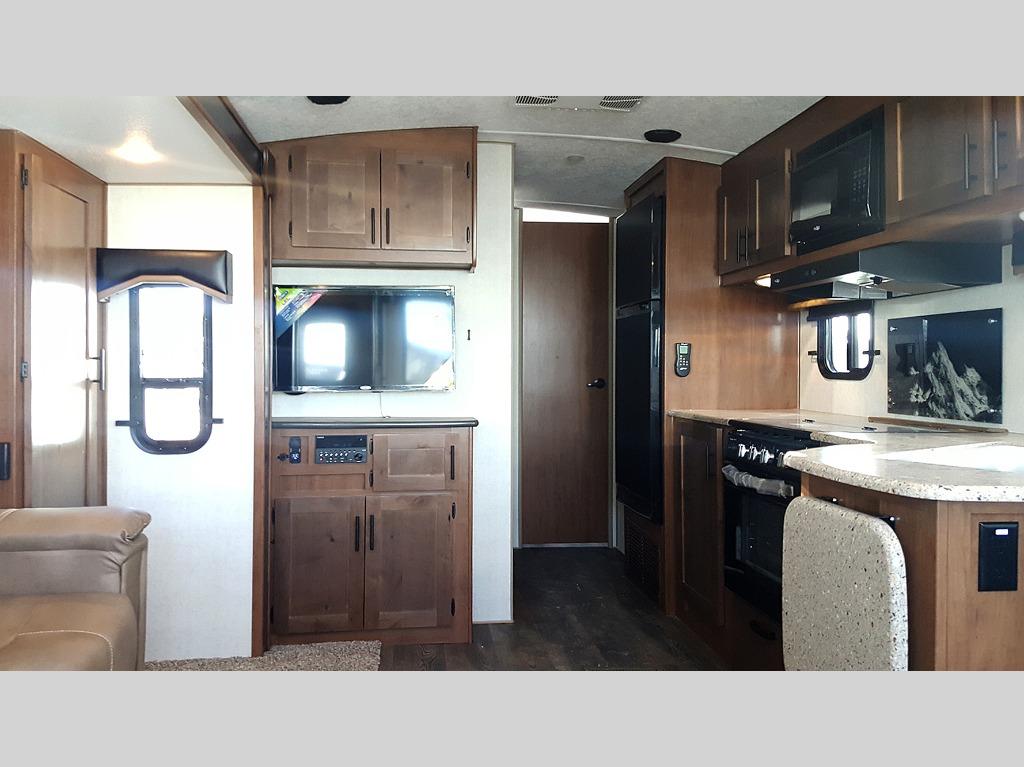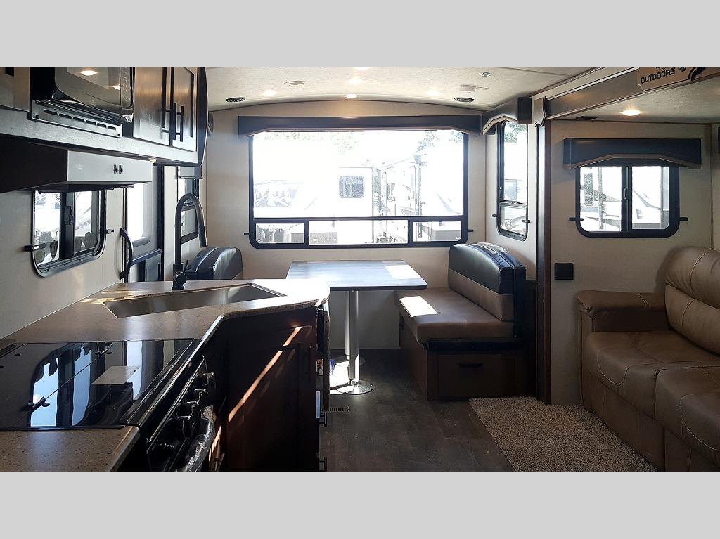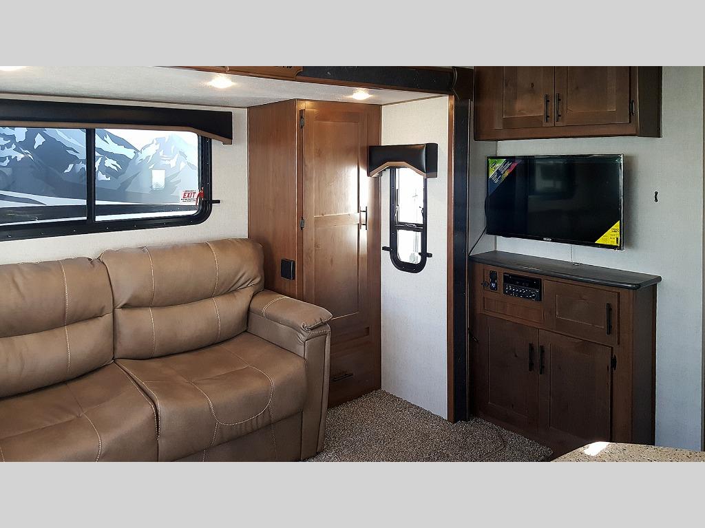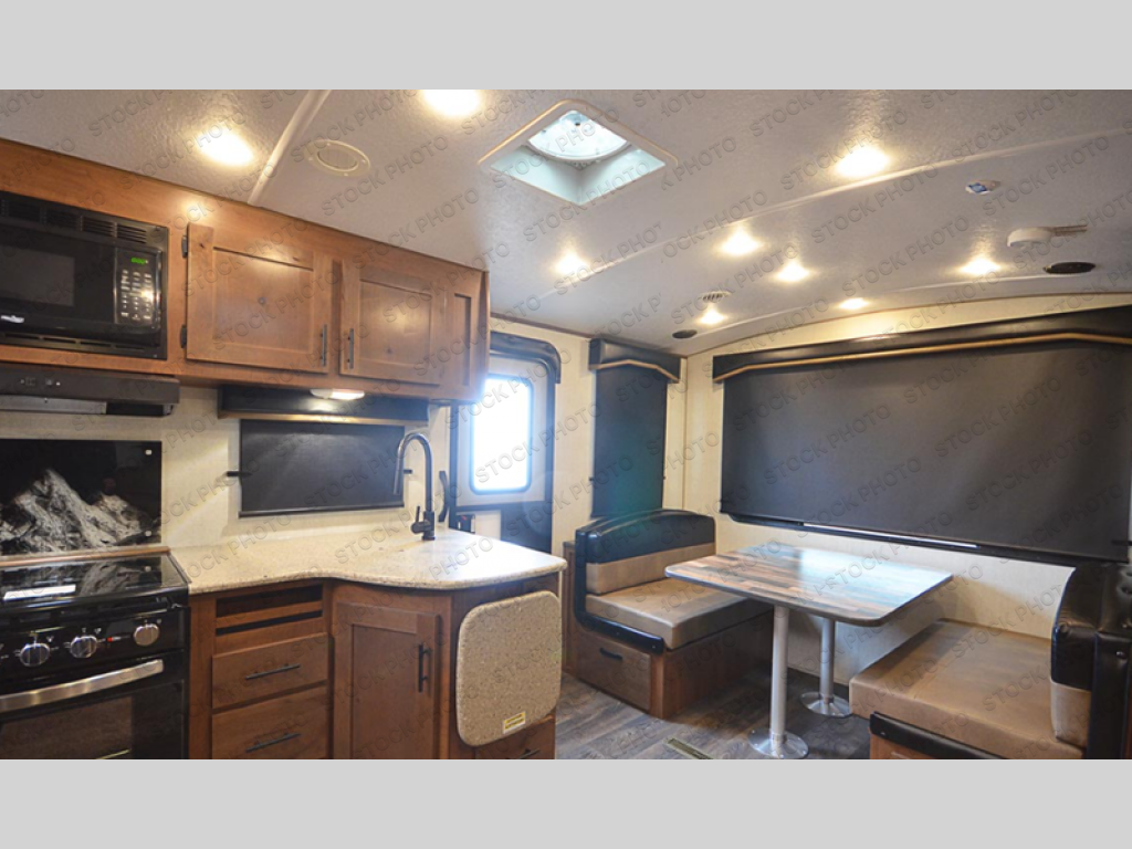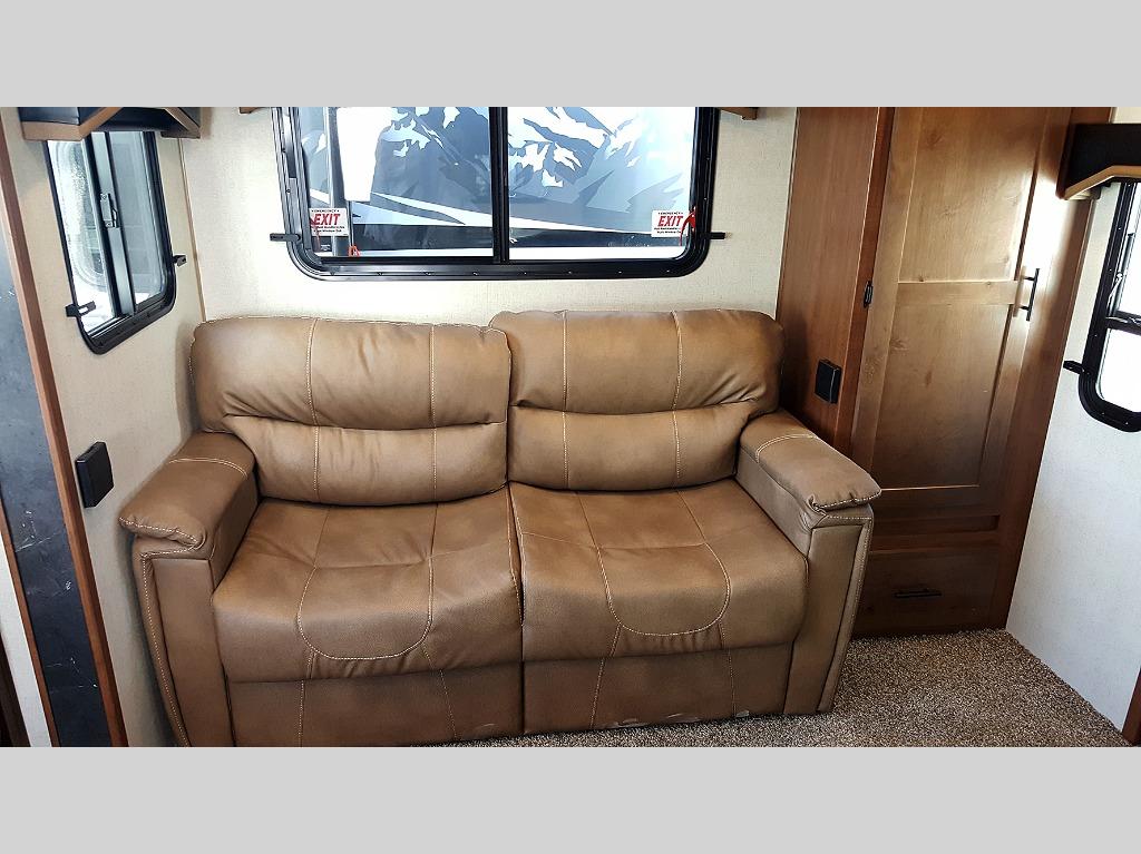 Camping trips are made complete when you have this travel trailer in tow. The rear mountain dinette provides a place to enjoy meals together, and the sleeper sofa slide out is close to the entertainment center for easy viewing of your movies. And if you're not needing the extra sleeping space, you can choose the optional residential sofa with built-in recliners! The chef of your group can prepare home-cooked meals in the kitchen, especially with a flip-up counter for more space. There is also a pantry, sunken range, 8 cu. ft. XL refrigerator, plus a high-rise pull out faucet for easy clean up. The full bath is towards the front of the unit where you'll find the private bedroom, complete with a queen bed and plenty of storage space for clothes, shoes, and more!