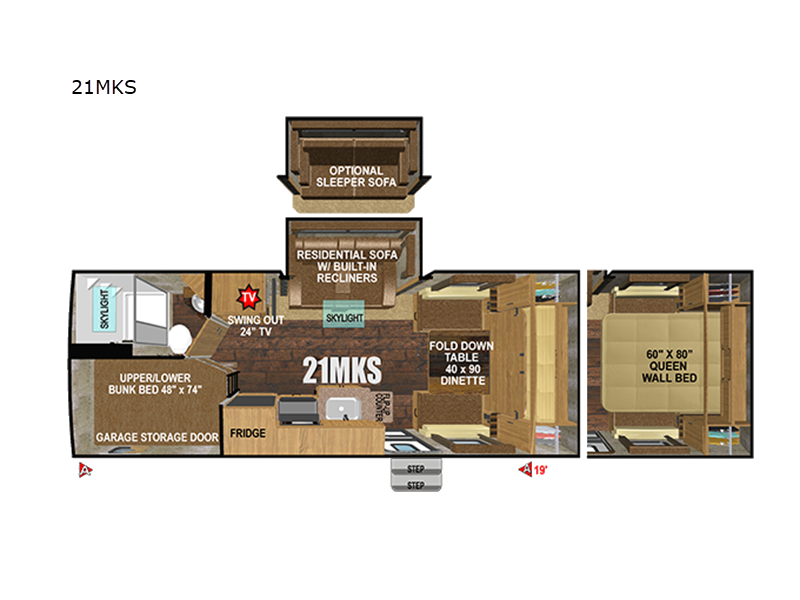 Versatile Sleeping Arrangements, Sofa with Built-In Recliners, 19' Awning, Full Bath with a Skylight & 48" x 74" Double-Size Bunks