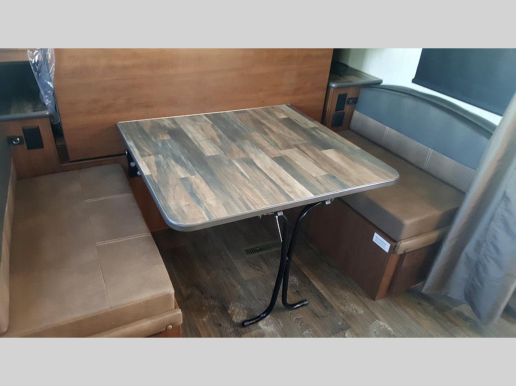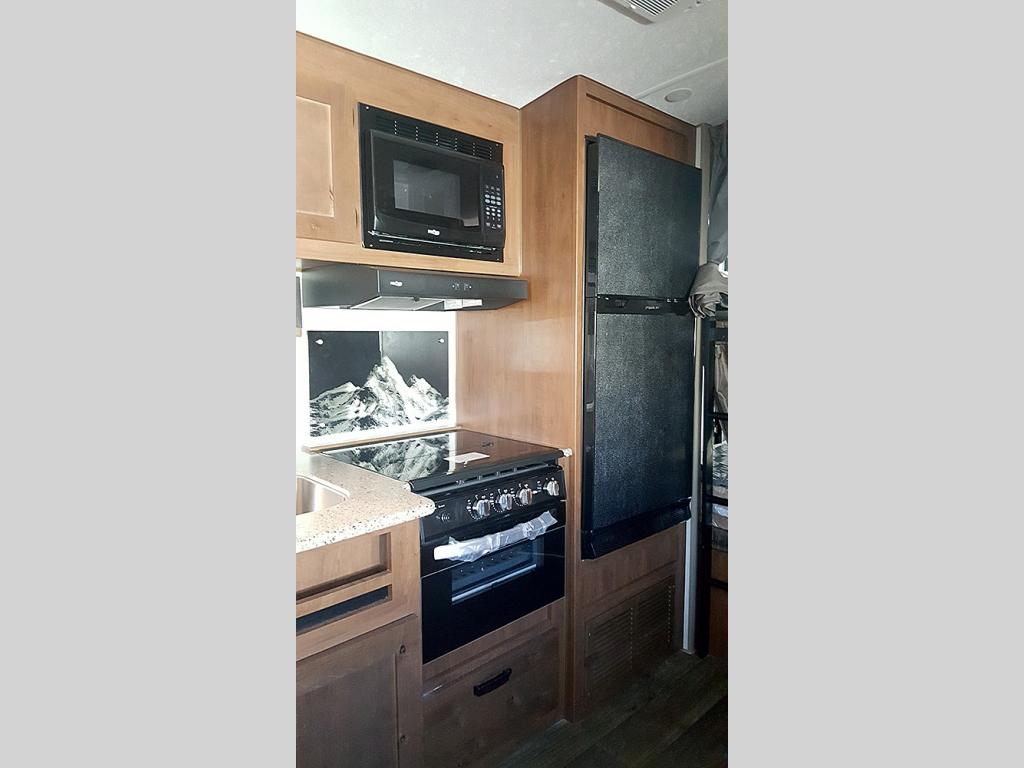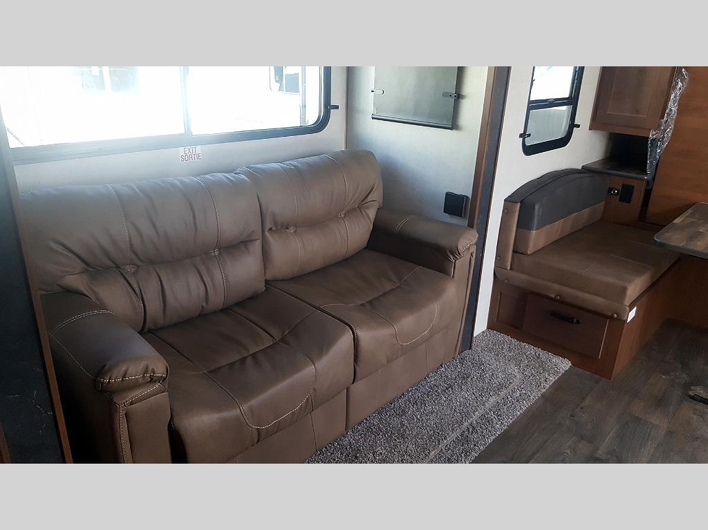 This is the perfect family-friendly travel trailer or for those who like to camp with friends! The double-size bunks in the back will provide fun sleeping space, and there is an exterior garage storage door where you can pack in gear directly under the bunks. The combined kitchen and living area includes a residential sofa with built-in recliners with a skylight above for natural light. There is also a fold-down dinette table and a front queen wall/Murphy bed for a great night's rest!