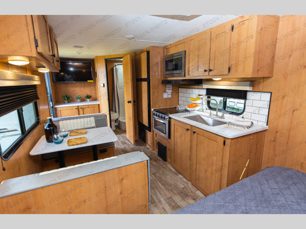 Front RV Queen Bed, Rear Corner Bathroom, Booth Dinette & Three Burner Cooktop