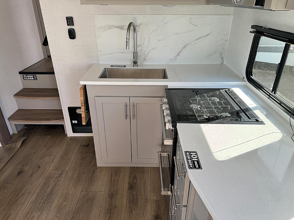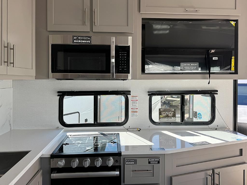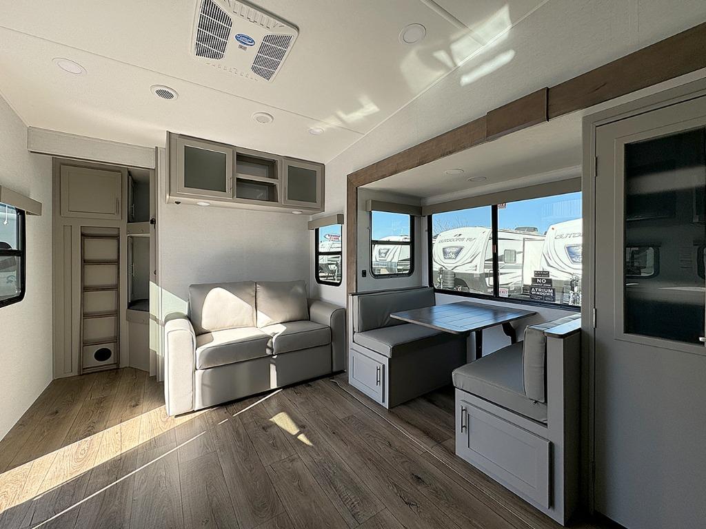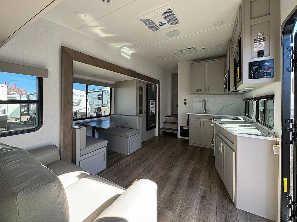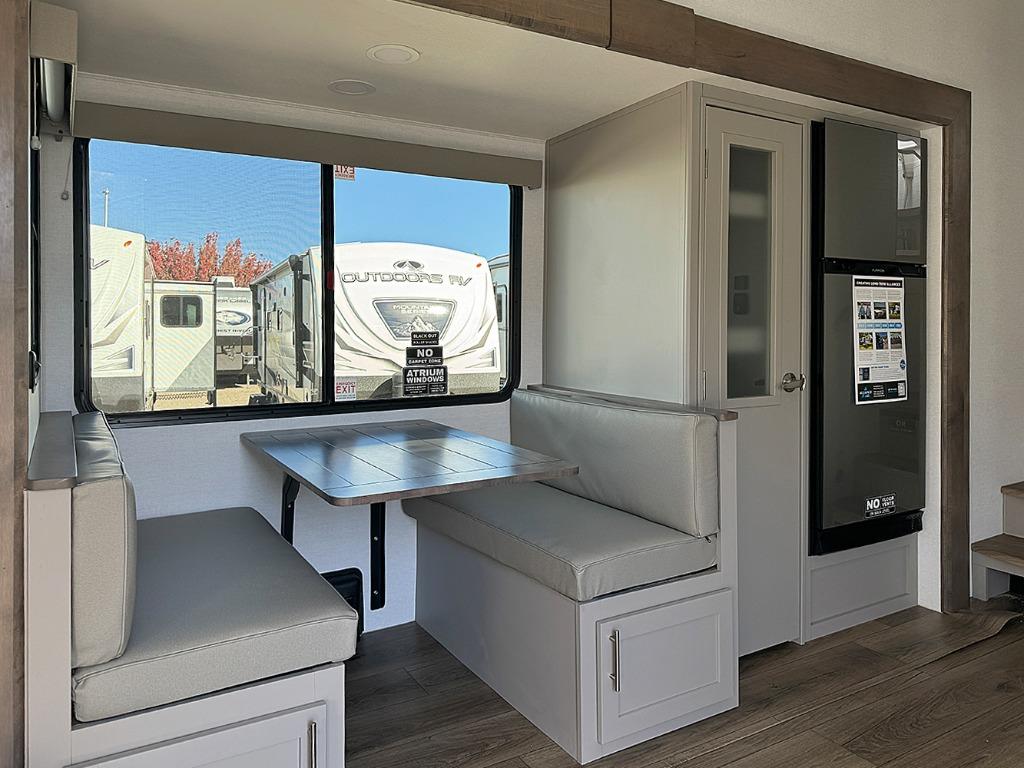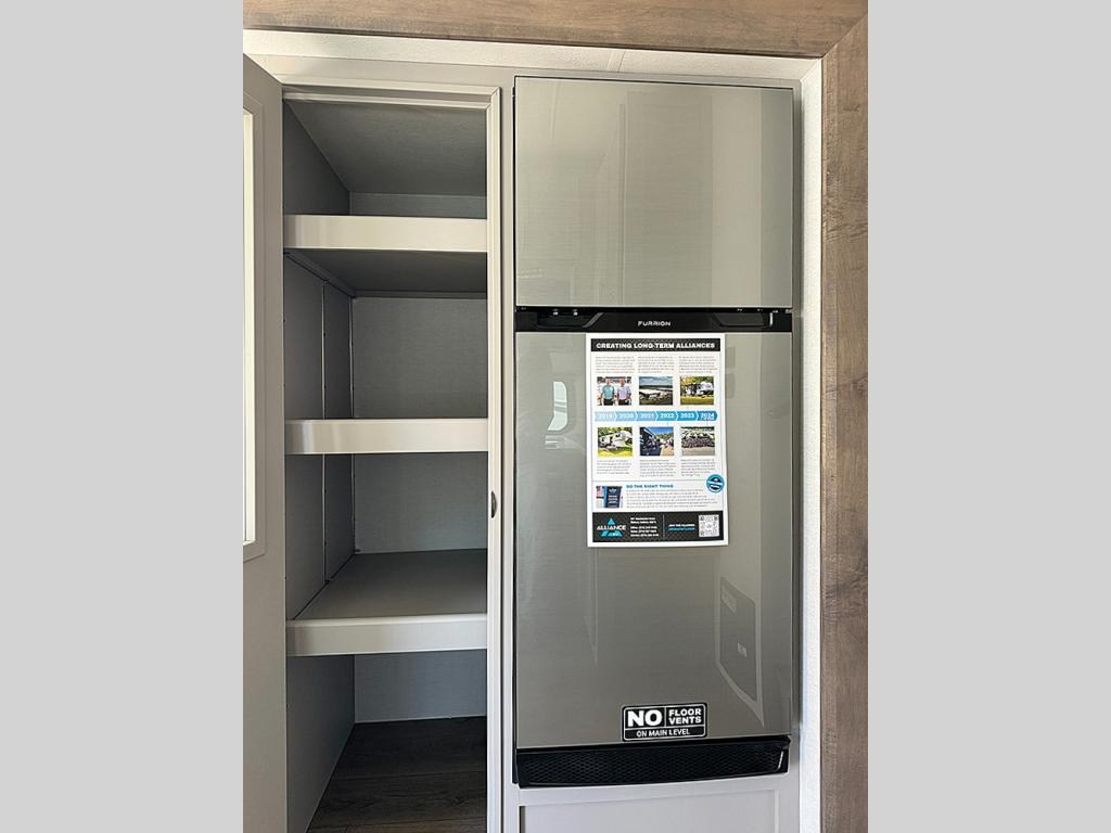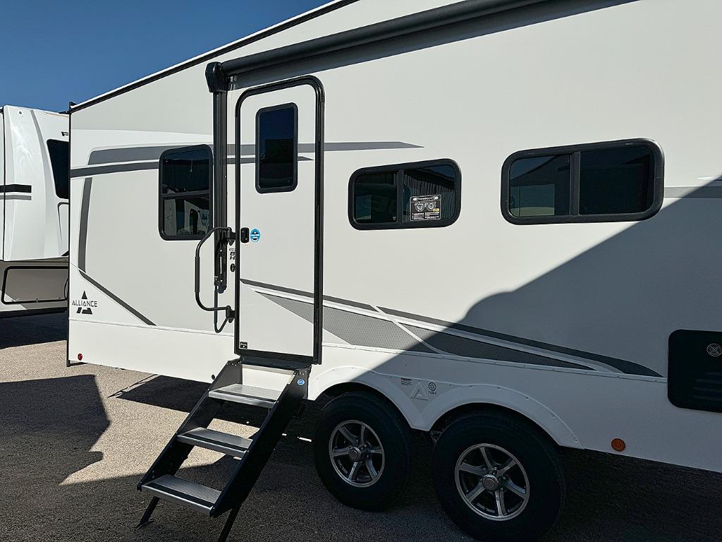 A benchmark chassis creates a space saver upper deck with each one of these Avenue All-Access fifth wheels by Alliance RV! The 101 in. wide-body construction gives you more room to walk around and the flush slide out floors throughout prevent any tripping. There are Azdel composite sidewalls inside and out, and a seamless fully walkable PVC roof for extreme durability and zero maintenance. You are sure to love the "no carpet zone" making each Avenue easy to clean and allergen free, not to mention pet friendly. You can maximize your space throughout with innovative storage solutions like the hidden storage behind the TV, inside the end tables, ottoman, and dinette chairs. These units also include the OTG Solar Package with a 200 watt solar panel, 15 amp MPPT charger, multiple outlets, and more to keep you powered up!