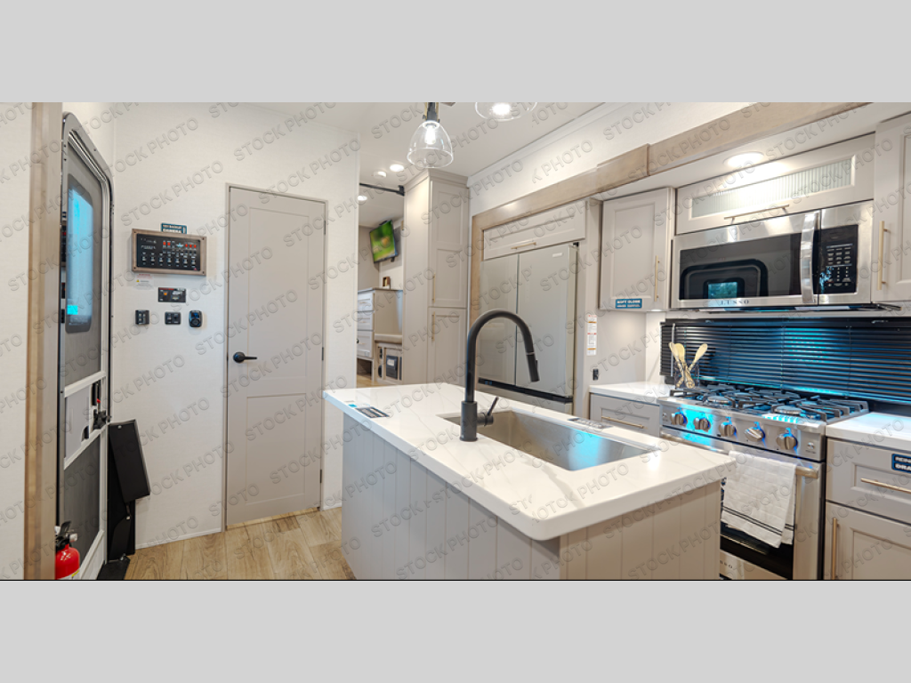 An active family will want this fifth wheel with its 48" x 115" exterior basement pull-out tray for kayaks or extra storage. Just above this area is the master suite with a rear bathroom that offers a residential shower, a porcelain toilet with soft close seat, plus a wardrobe and shelf storage. The king bed slide gives you more floor space, and you will have a seat, a flip-top dresser, and a Smart TV to watch movies in bed. The half bath is next to the main entry which is super convenient, and the middle kitchen is separate from the front living area. The cook will love the residential microwave, range and oven, plus the 19 cu. ft. 12 volt residential refrigerator. There is also a pantry and extra counter space on the kitchen island with a large sink. The views out of the atrium windows in the slide out, which includes the swivel table and desk, are a must see. And when you need to watch the big game, the 55" Smart TV with a pull-out fireplace storage are up front with the dual recliner love seat and two sleeper sofas.