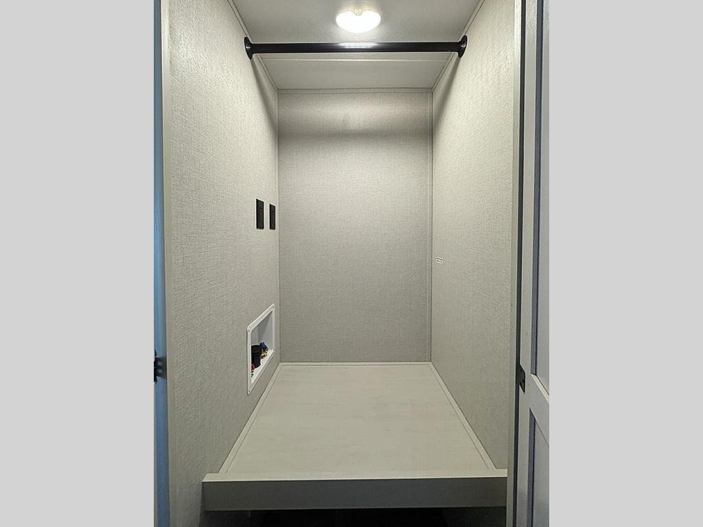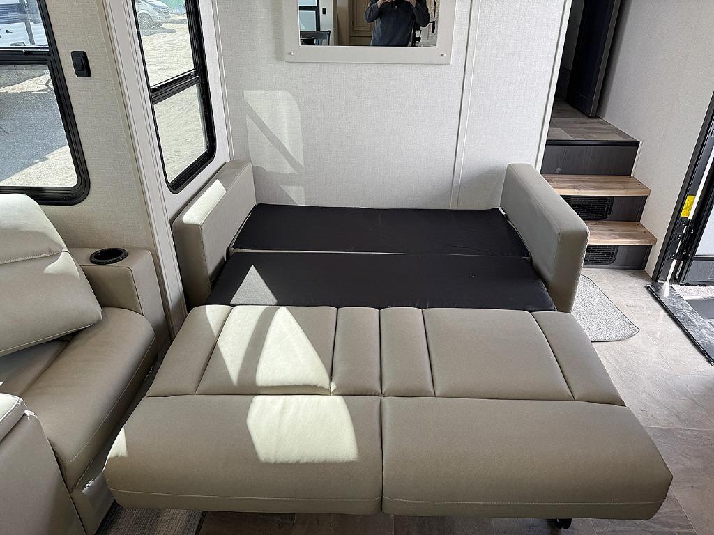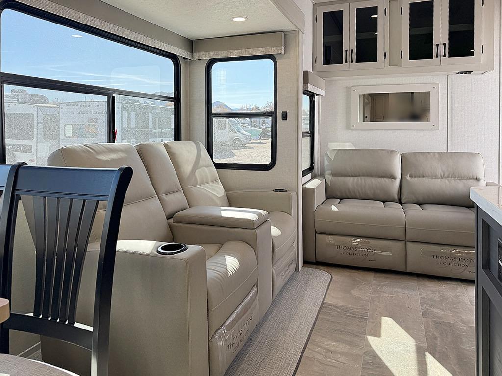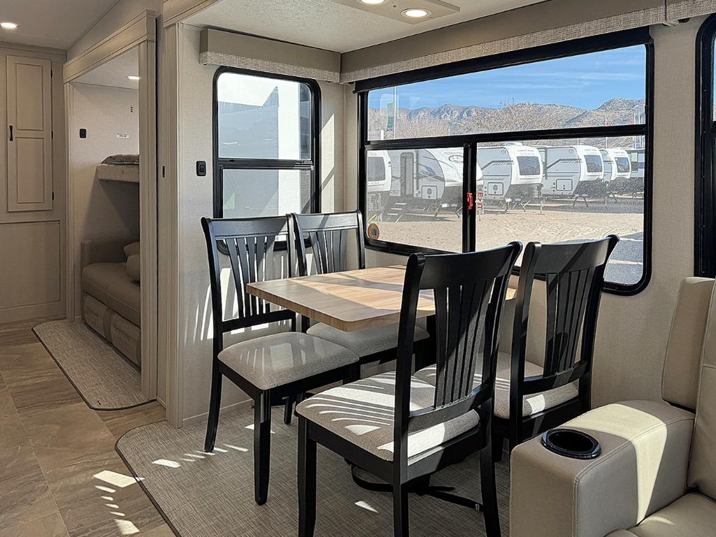 Camping with a large group of friends or family is easier than ever in this roomy fifth wheel for seven to eight. There are two full baths, with your guests having their own bath with its own exterior entry door in in the bunkhouse; how convenient! The chef of your group will find all they need in the interior kitchen, or they can cook on the outside kitchen. Inside, there is comfortable seating spaces on the sofa, the theatre seating, and the free-standing table, plus you can enjoy the 50" 4K Smart LED TV within the entertainment center for even more fun. Having your own bedroom to retreat to each night will be much appreciated. There is a queen bed, wardrobe slide out, dual nightstands, and even washer and dryer prep!