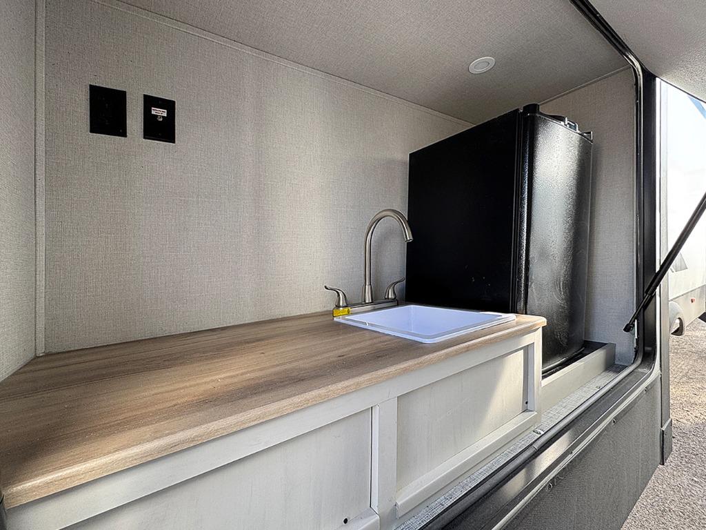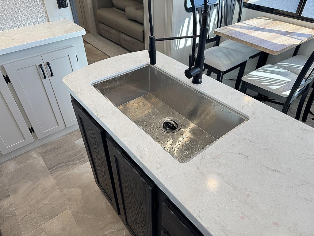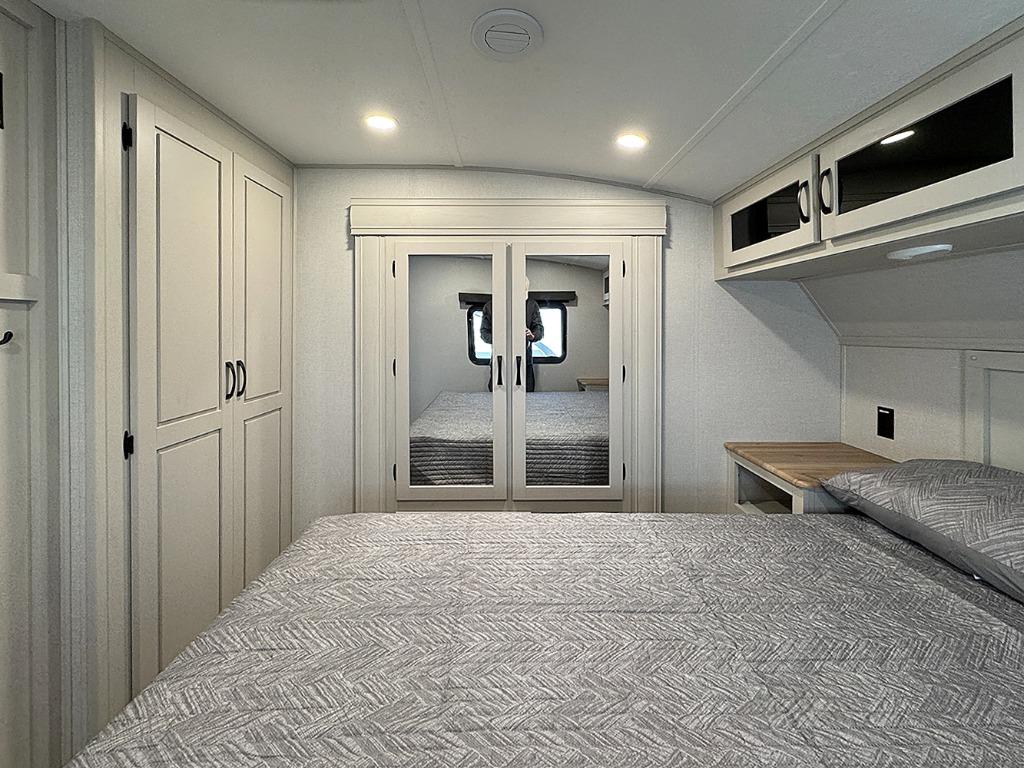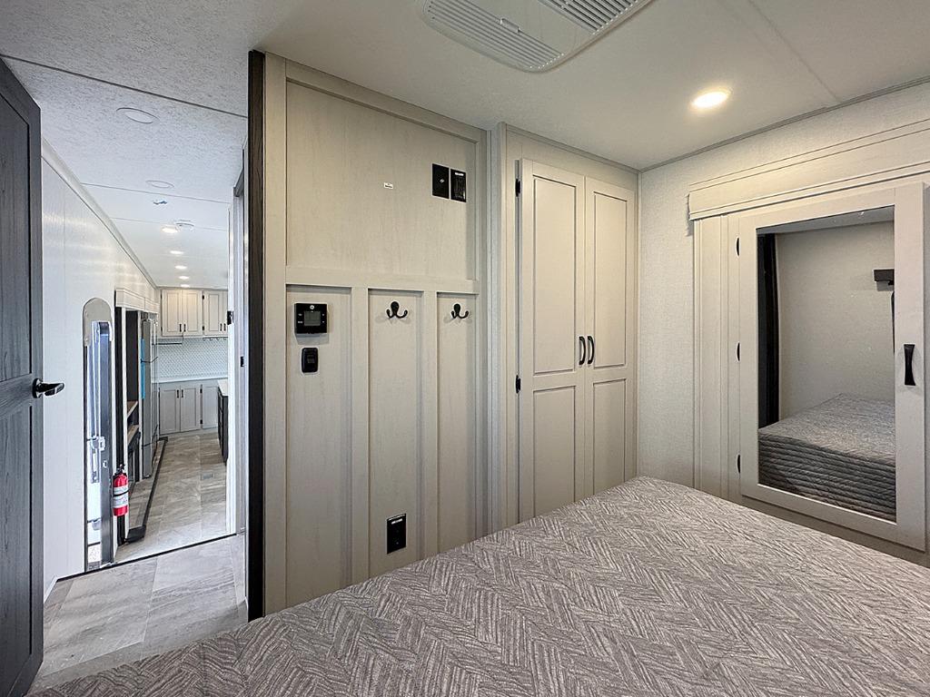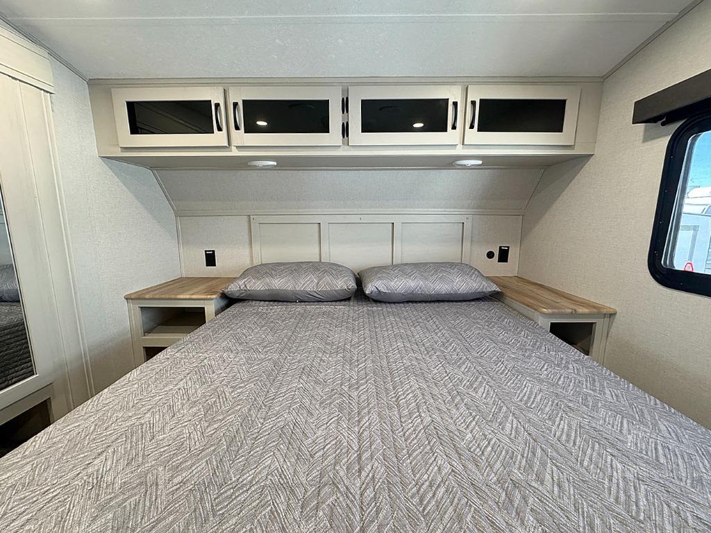 Camping with a large group of friends or family is easier than ever in this roomy fifth wheel for seven to eight. There are two full baths, with your guests having their own bath with its own exterior entry door in in the bunkhouse; how convenient! The chef of your group will find all they need in the interior kitchen, or they can cook on the outside kitchen. Inside, there is comfortable seating spaces on the sofa, the theatre seating, and the free-standing table, plus you can enjoy the 50" 4K Smart LED TV within the entertainment center for even more fun. Having your own bedroom to retreat to each night will be much appreciated. There is a queen bed, wardrobe slide out, dual nightstands, and even washer and dryer prep!