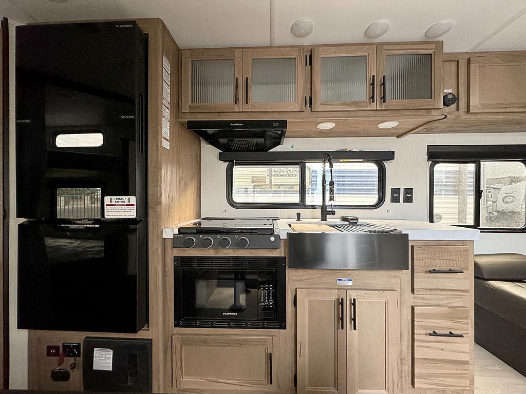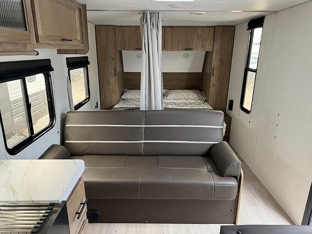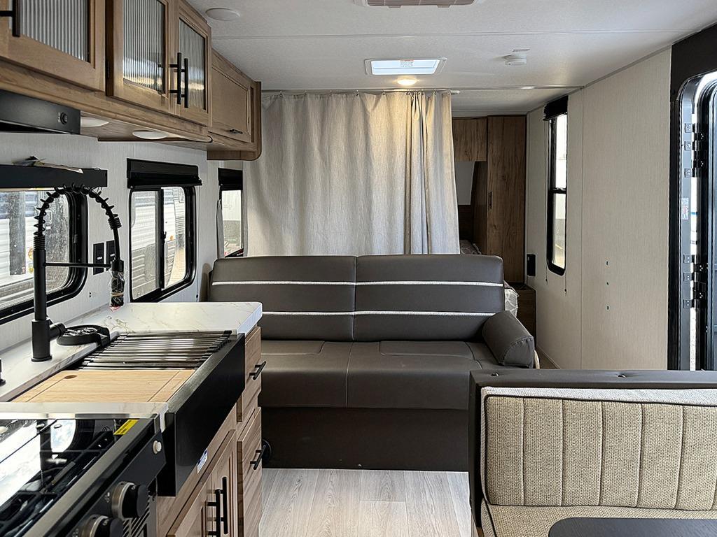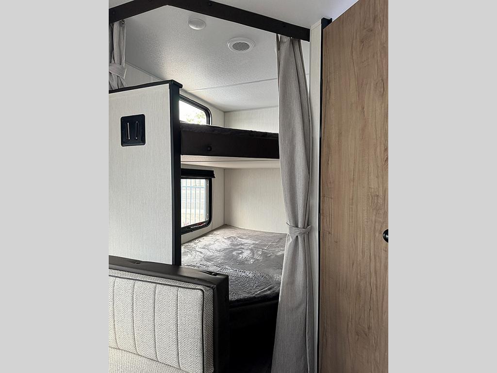 If you like to camp with more friends and family, this travel trailer is for you! Since there are double-size bunks, a queen bed, plus a sofa and booth dinette, you can sleep eight people each night! The front bedroom includes the RV king bed, along with dual bedroom wardrobes and USB ports to charge your phones overnight. A full kitchen, complete with an air fryer and refrigerator will let the chef do their thing, and everyone can head outdoors to sit under the 15' patio awning!