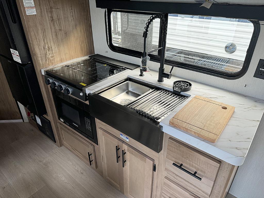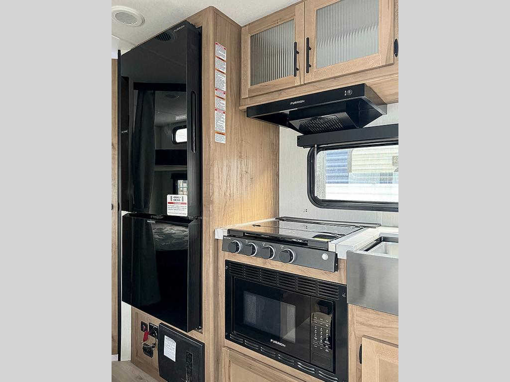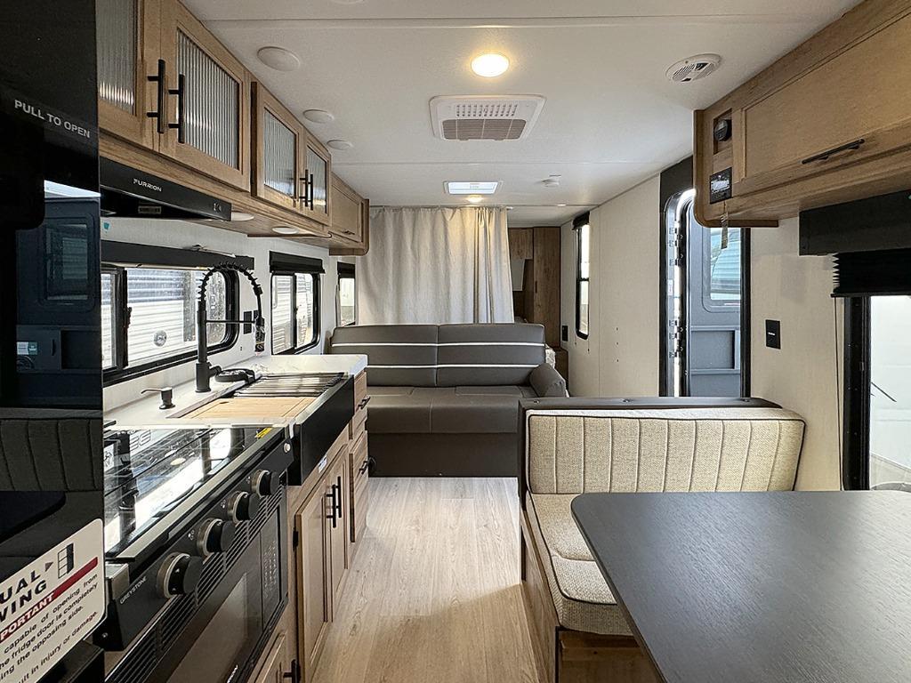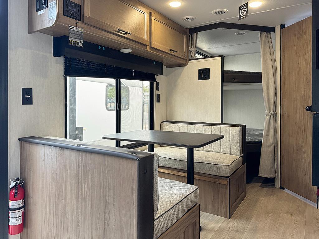 If you like to camp with more friends and family, this travel trailer is for you! Since there are double-size bunks, a queen bed, plus a sofa and booth dinette, you can sleep eight people each night! The front bedroom includes the RV king bed, along with dual bedroom wardrobes and USB ports to charge your phones overnight. A full kitchen, complete with an air fryer and refrigerator will let the chef do their thing, and everyone can head outdoors to sit under the 15' patio awning!
