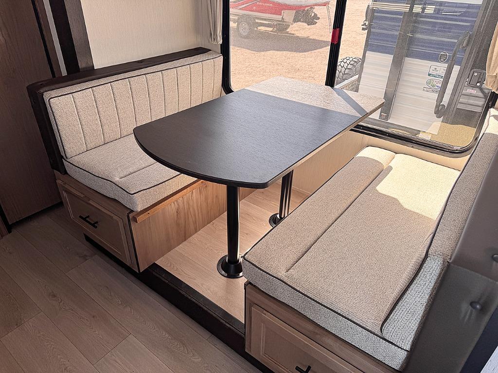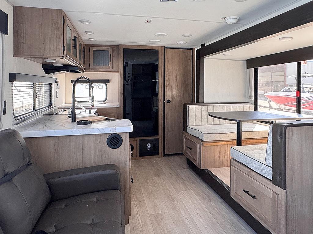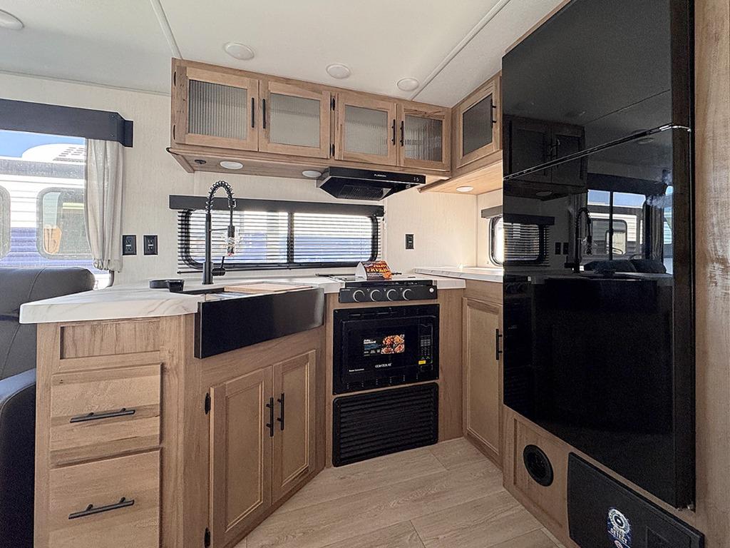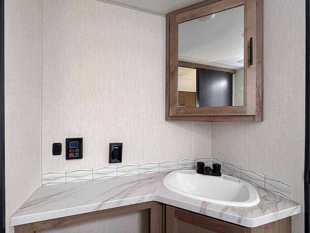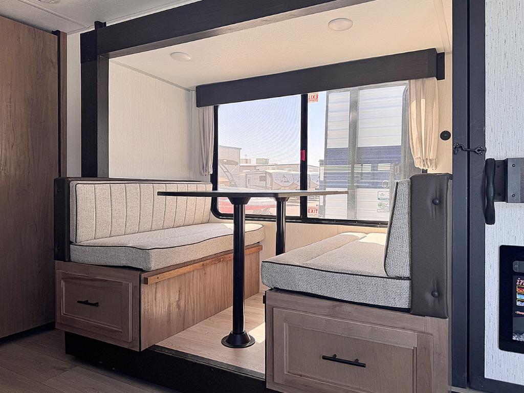 You'll love every minute spent in this single slide out travel trailer, whether you're cooking dinner on the outside kitchen or in the rear kitchen, relaxing on the sofa across from the fireplace, or sleeping on the RV king bed in the front master bedroom! There are hidden shelves behind the fireplace for convenient storage, and the booth dinette within the slide provides a place to dine together. The walk-thru bath is spacious, and includes a tub/shower, toilet, and sink with counter space.