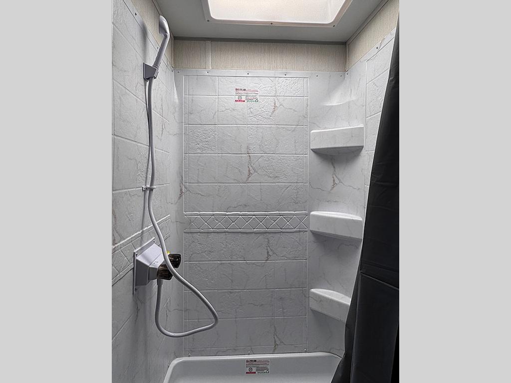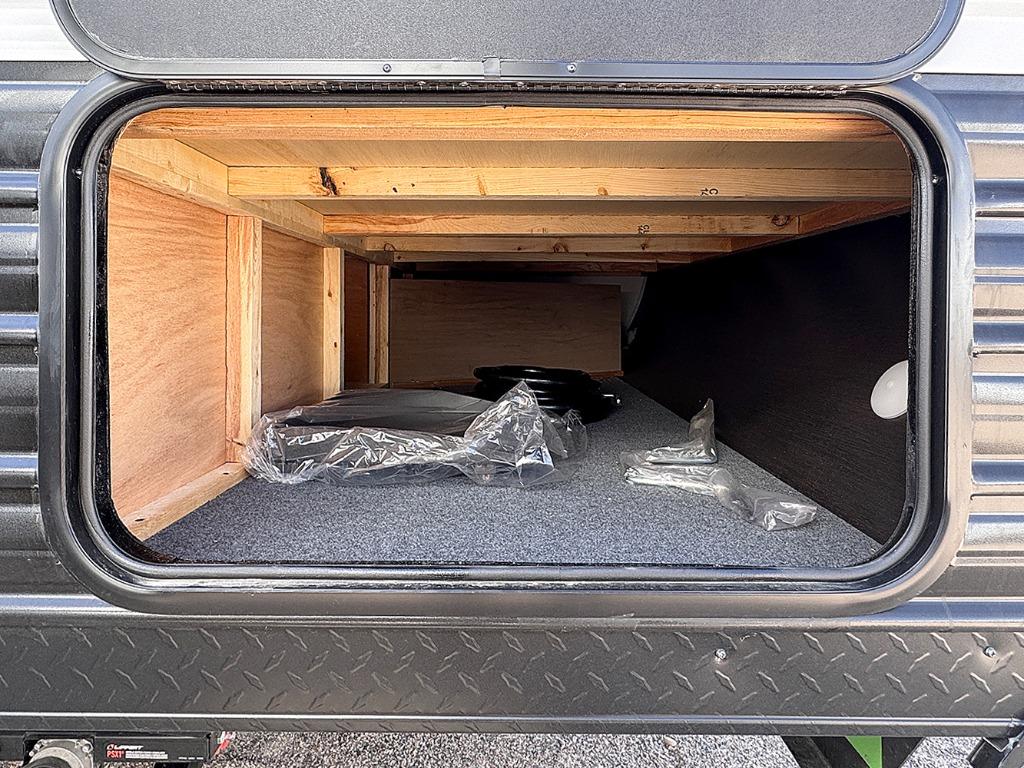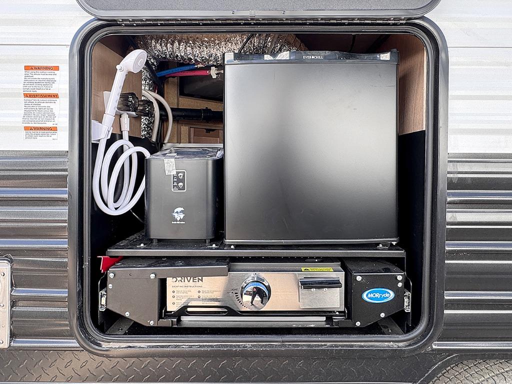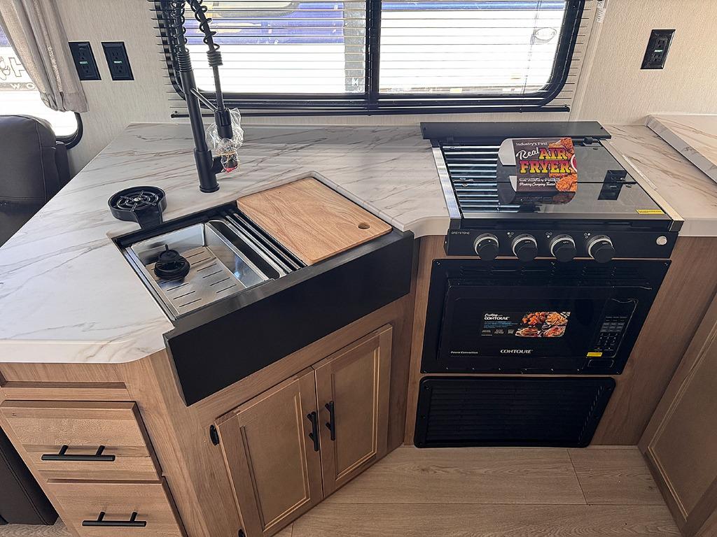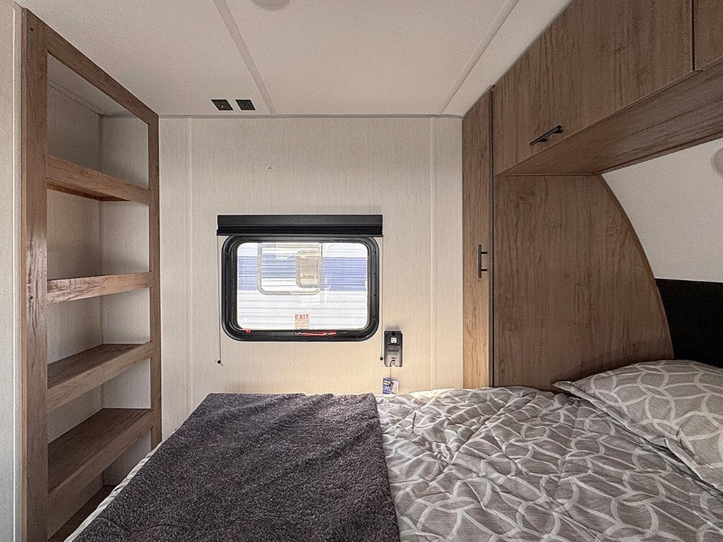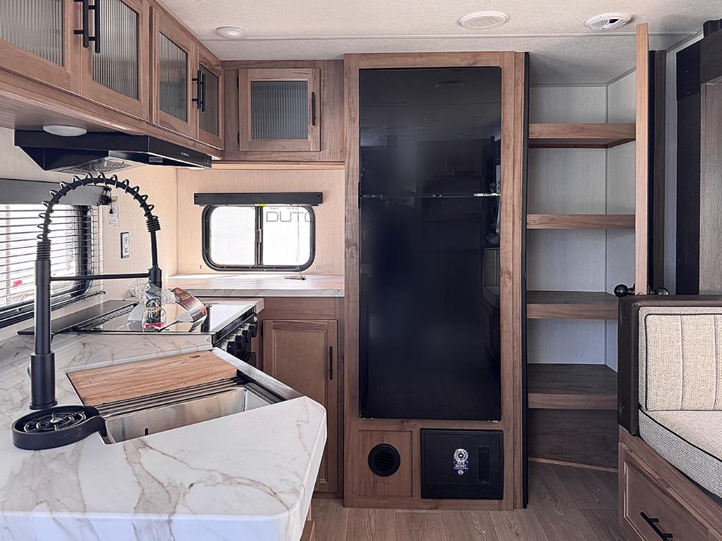 You'll love every minute spent in this single slide out travel trailer, whether you're cooking dinner on the outside kitchen or in the rear kitchen, relaxing on the sofa across from the fireplace, or sleeping on the RV king bed in the front master bedroom! There are hidden shelves behind the fireplace for convenient storage, and the booth dinette within the slide provides a place to dine together. The walk-thru bath is spacious, and includes a tub/shower, toilet, and sink with counter space.