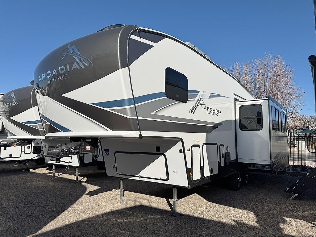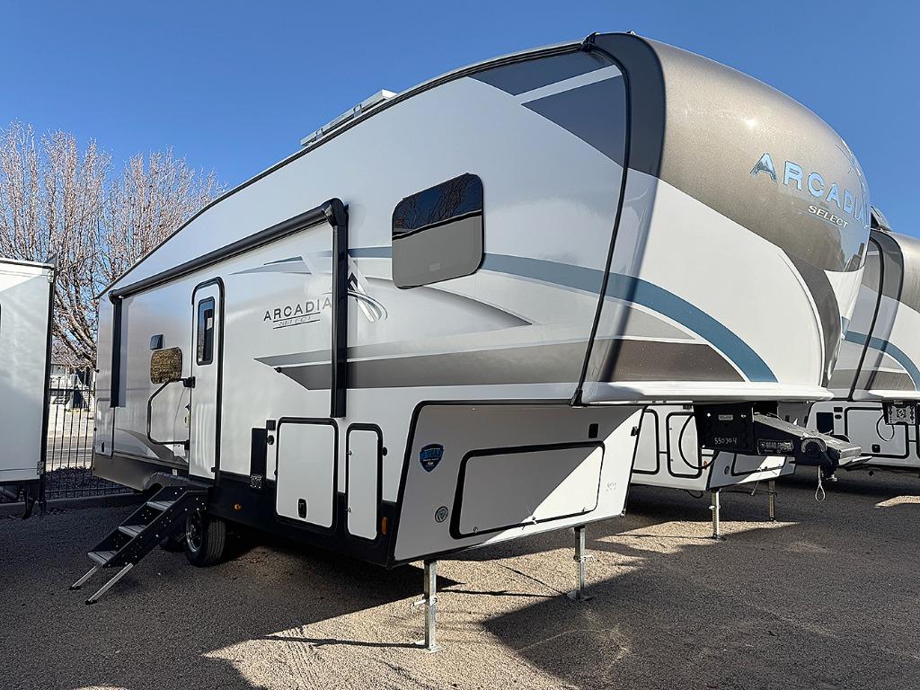 With any Arcadia Select fifth wheel by Keystone you will enjoy easy towability and at-home comforts at an affordable price! The laminated sidewalls with five sided aluminum superstructure will provide a strong foundation so you can enjoy your RV for years to come, plus a one-piece, heated and enclosed polypropylene underbelly means you can camp year around! And an upgraded Roto-Flex hitch pin with will make it easy to tow. Head inside to find tall slides for added space, seamless, pressed countertops, convenient underbed storage, and a large shower with a retractable door and skylight. These fifth wheels also include a Blade Pure A/C system, Girard on-demand tankless water heater, two 30 lb. LP tanks, and more utilities to make your camping experience run smoothly.