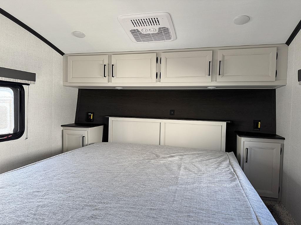 Trips to the lake are made complete in this spacious fifth wheel that can sleep five each night. You'll enjoy your own private bedroom up front that includes a queen bed, a wardrobe, plus bedside wardrobes and nightstands for your things. After you've made dinner on the cooktop, you can dine at the booth dinette. There is additional seating on the tri-fold sofa, and both of these areas can double as sleeping space for guests. If you're wanting a little more comfort, just choose the optional theater seating in place of the sofa. A flip-up desk in the back will let you get some work done if needed, and the hidden walk-in pantry behind the TV/fireplace is a huge convenience!