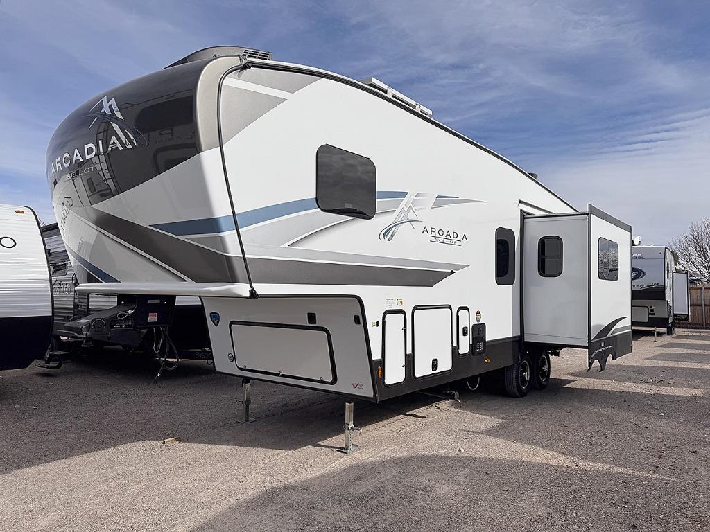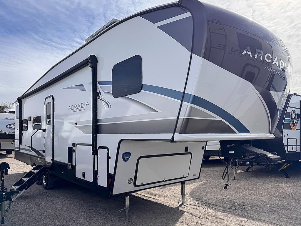 With any Arcadia Select fifth wheel by Keystone you will enjoy easy towability and at-home comforts at an affordable price! The laminated sidewalls with five sided aluminum superstructure will provide a strong foundation so you can enjoy your RV for years to come, plus a one-piece, heated and enclosed polypropylene underbelly means you can camp year around! And an upgraded Roto-Flex hitch pin will make it easy to tow. Head inside to find tall slides for added space, seamless, pressed countertops, convenient underbed storage, and a large shower with a retractable door and skylight. These fifth wheels also include a Blade Pure A/C system, Girard on-demand tankless water heater, two 30 lb. LP tanks, and more utilities to make your camping experience run smoothly.