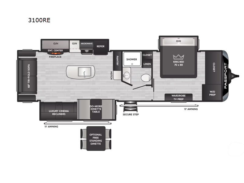 Kitchen Island, Fireplace, Front Private Bedroom & Two Awnings