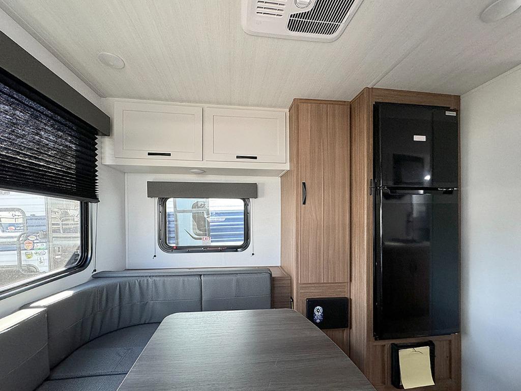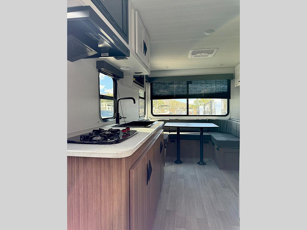 Pack your bags and hitch up this travel trailer for a fun weekend excursion! You can get a good night's sleep on the front queen bed with a wardrobe at the foot of the bed, and overhead cabinets above it for your items. You can also transform the U-shaped dinette with a counter next to it into an extra sleeping space. The chef of your group can make meals on the two burner range or in the microwave if you're on the go. There is also a large double door 12V refrigerator and pantry for food storage. Outside, you can relax underneath the patio awning and store all of your gear in the front exterior pass-through storage area!