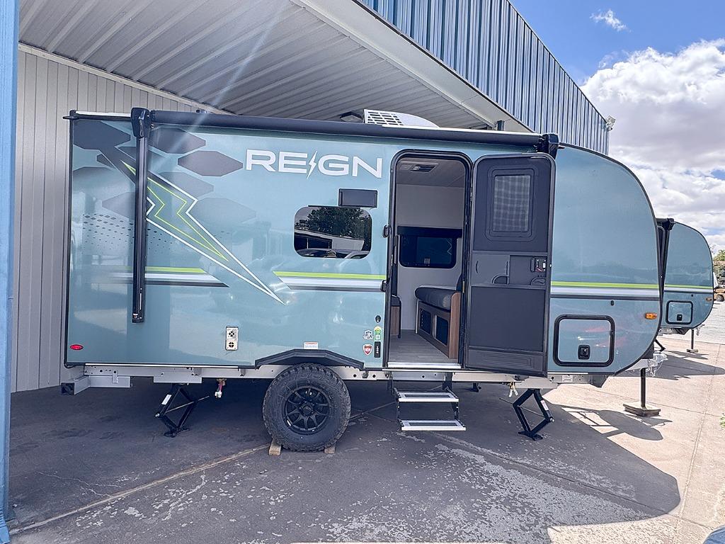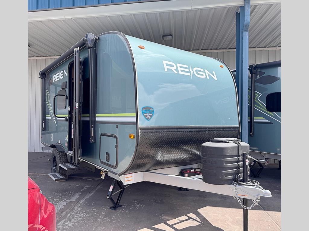 The Reign travel trailers by Keystone are premium single-axle units that are sure to make an impression at the campground. Each one is built with an exclusive automotive-finished aluminum exterior, a walkable roof, and a 100% composite floor for added durability. There are also tinted safety glass windows, quick drop stabilizer jacks, and an exterior shower with hot and cold water. The European inspired interior design is unique and cozy, and the 78" interior height will give you plenty of space to move about. You will also enjoy the ultra bright LED light strip and solid surface countertops in the kitchen, along with blackout night shades, and many more interior comforts.