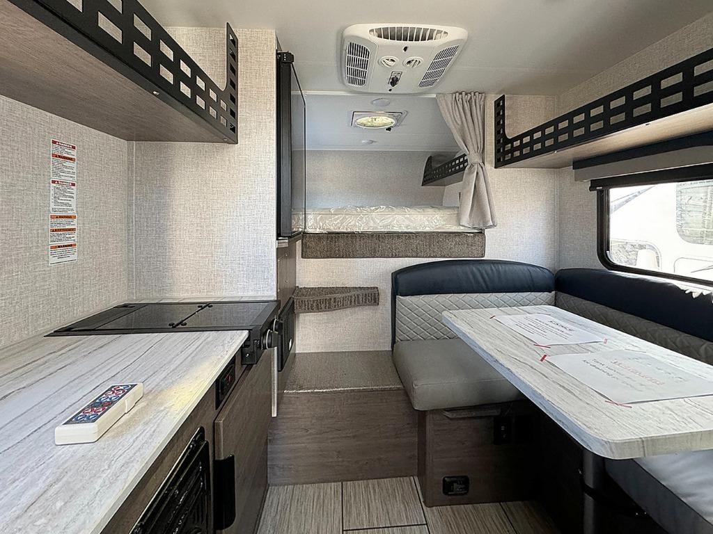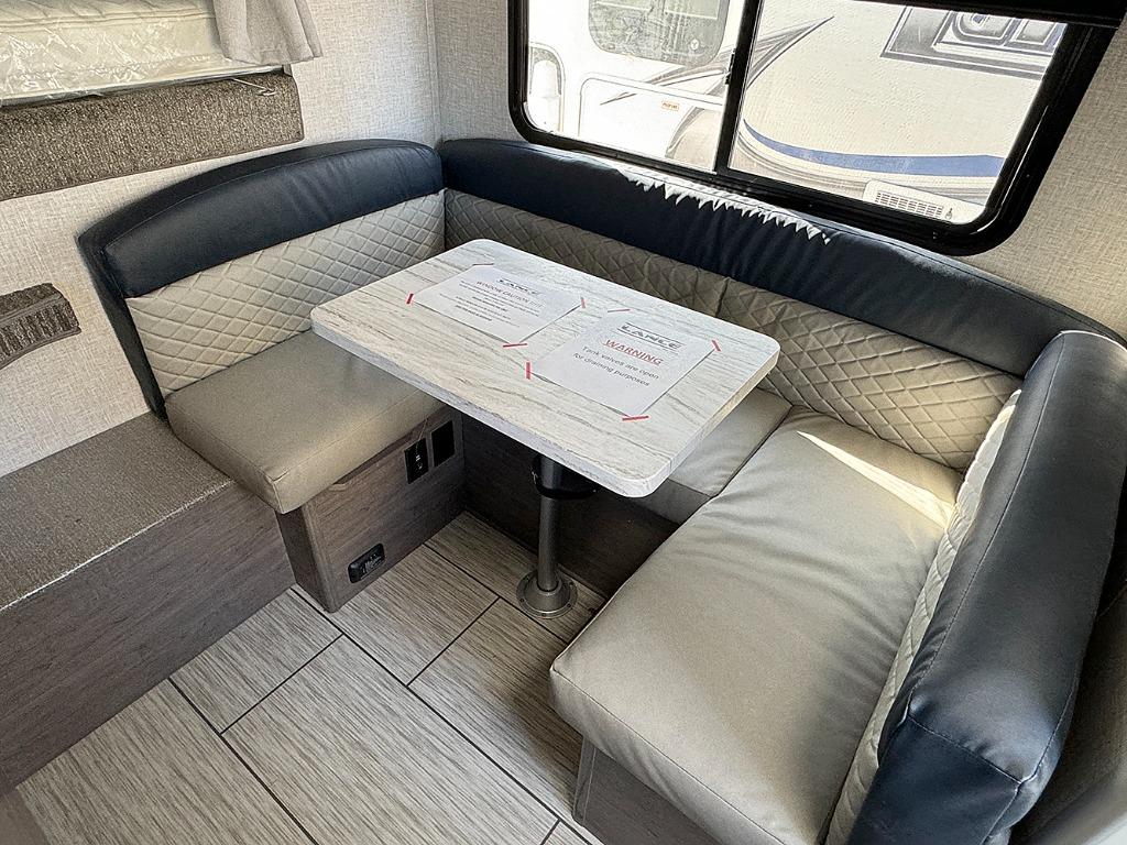 U-Shaped Dinette, Two Burner Cooktop, Front Queen-Size Bed, Clothing Closet & Wet Bath