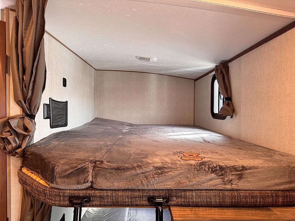 Outdoor enthusiast love this Back Country for many reasons when they camp at local campgrounds, state parks, off-grid and even at friend's ranches. The handy garage storage door allows you to place items from the exterior into the interior for safe travels under the bunks. The double-size bunks and ladder allow four to sleep each night, the mountain dinette and sleeper sofa offer three to four more spaces, and the owners will enjoy their own queen bed in the front private bedroom. The kitchen offers full amenities, the swing-out 40" TV offers inside entertainment, and the full bathroom will keep everyone clean after a fun day outdoors. There is more, step inside to see it all!