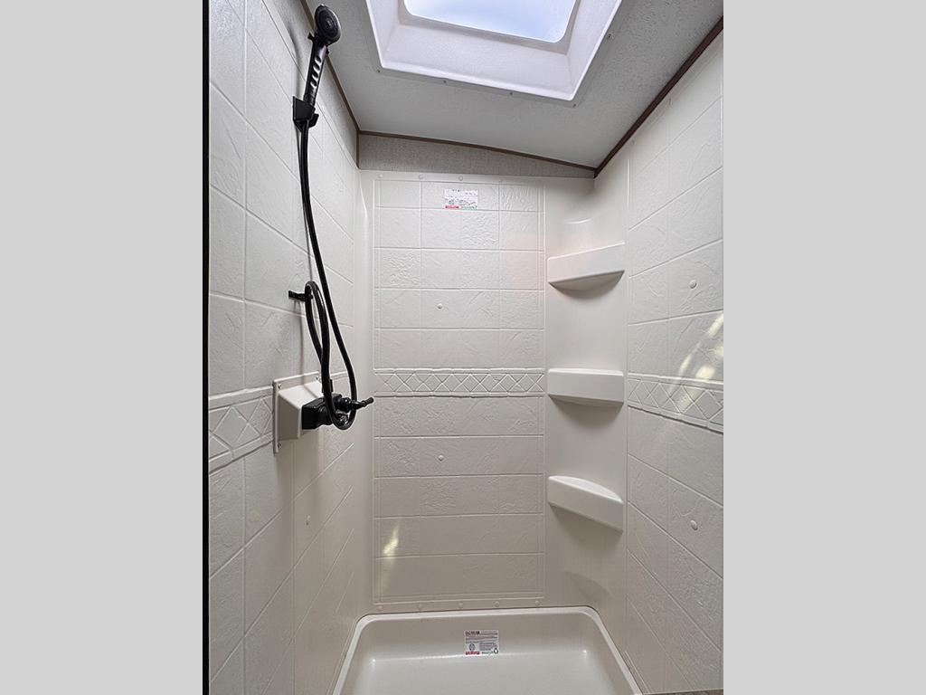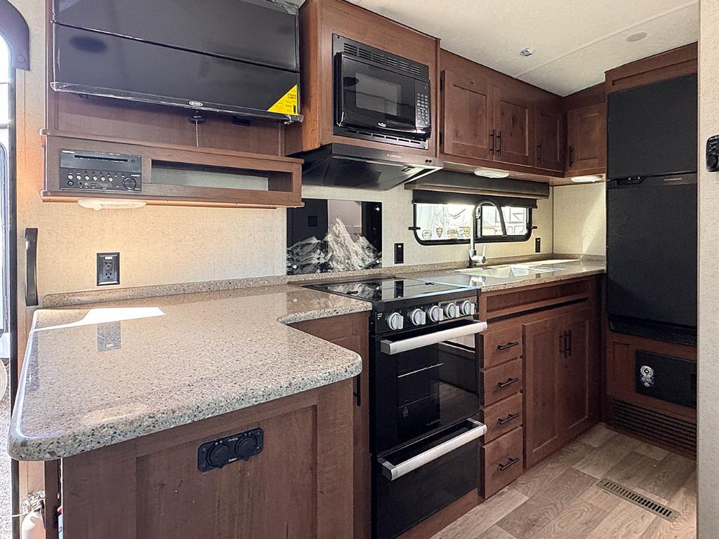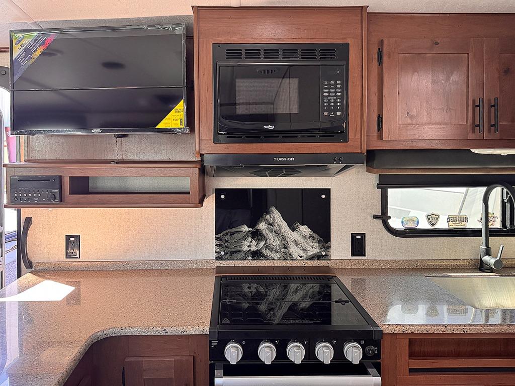 Versatility and comfort is found in this spacious travel trailer. There is a queen Murphy bed up front that can fold away into the wall so you can dine at the fold down booth dinette. The residential sofa with built-in recliners will be the perfect place to relax as you watch a movie on the swing out 32" TV, and the single slide out here will provide more interior space. This model includes a rear corner kitchen with plenty of counter space to prep meals and the full bath is in the other rear corner for privacy. You'll also enjoy the shower skylight for more head room, plus a living area skylight for more natural light.