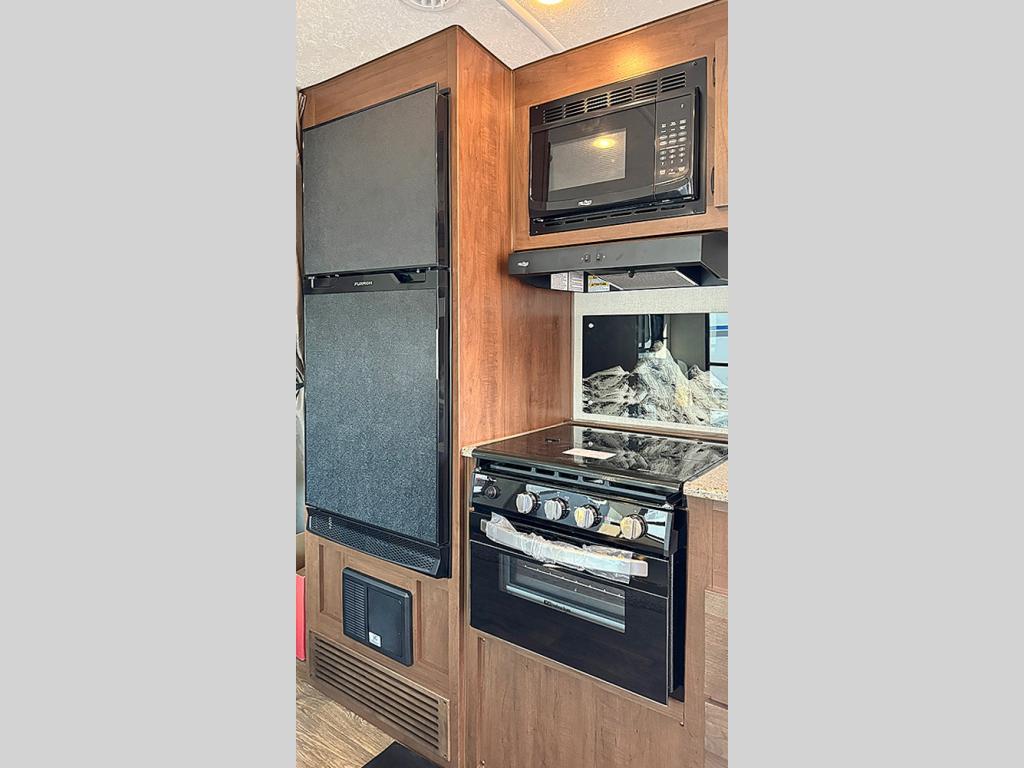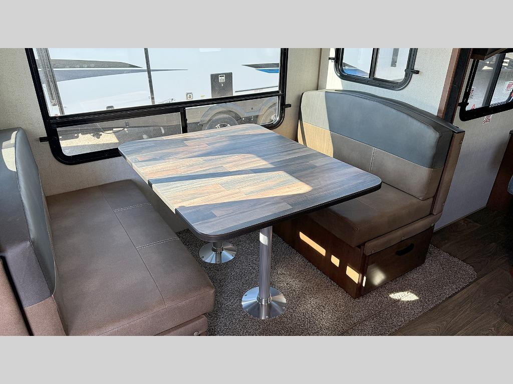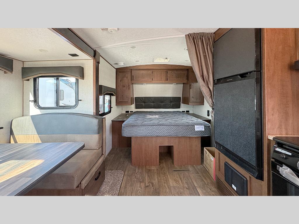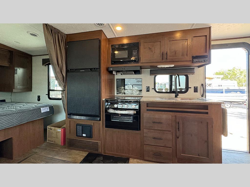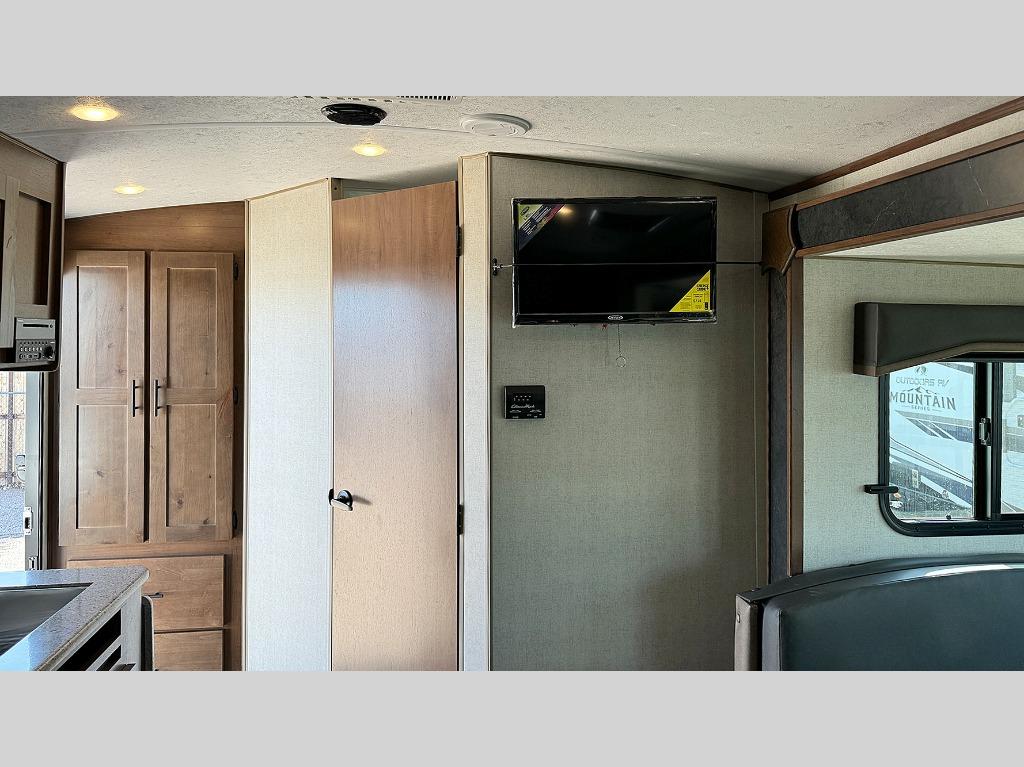 Camping in the mountains has never been more relaxing than in this single slide out travel trailer. You will have a full bath to clean up in each morning, and a three burner cooktop in the kitchen to prepare breakfast. The mountain dinette slide will be perfect for dining together, and if you have any overnight guests, they can sleep here. You will have the queen bed all to yourselves up front with dual bedroom wardrobes to keep your clothes tidy. This model also includes a 17' awning so you can visit outdoors protected from the elements.