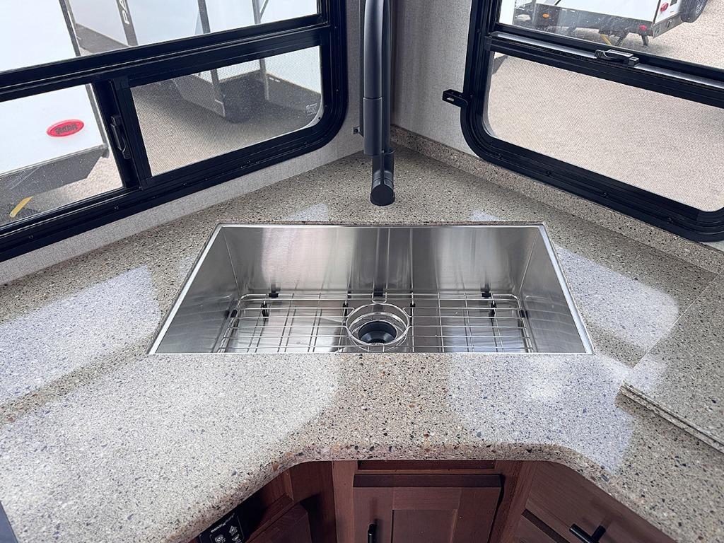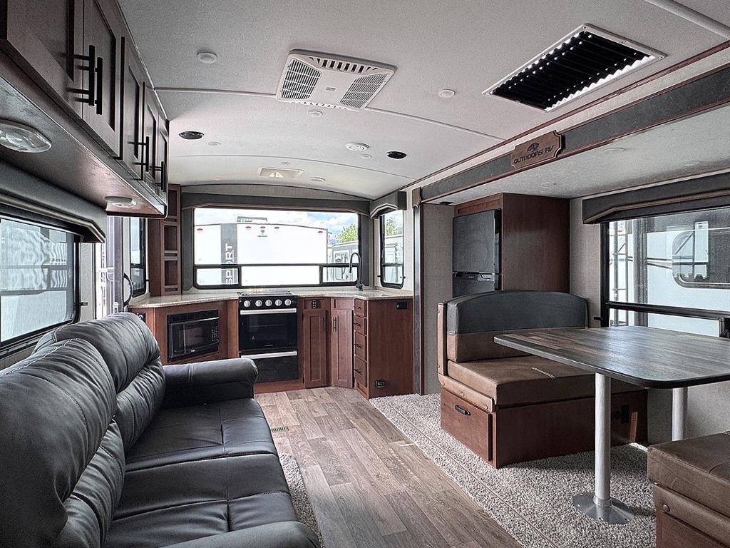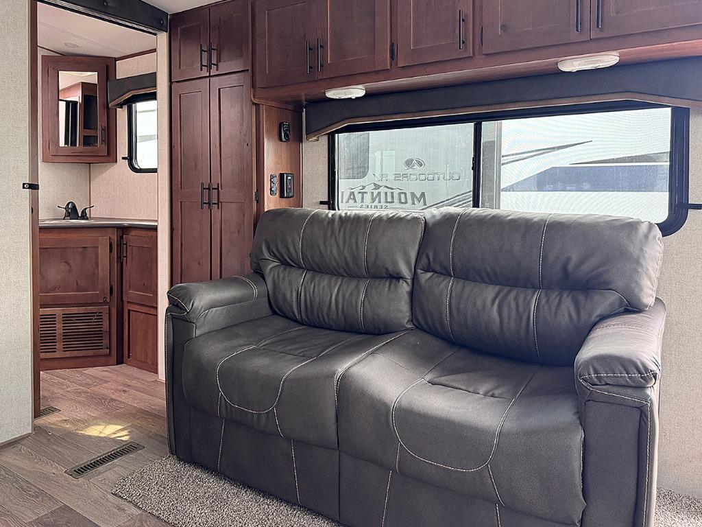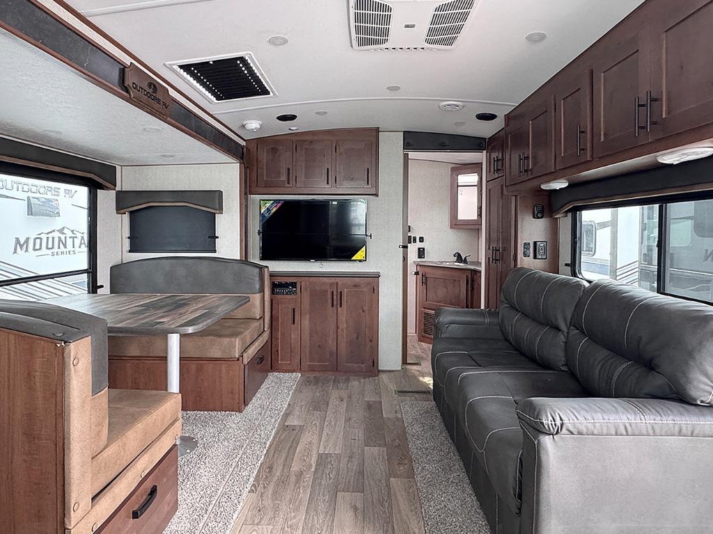 With any Timber Ridge Mountain Series travel trailer by Outdoors RV you will enjoy climate designed four seasons camping thanks to the thermal pane windows and the fully enclosed, heated, and insulated underbelly. The custom built chassis and rugged integrated A-frame are built for strength and durability, along with the rugged 2" bonded aluminum frame walls. Each model includes LG solid surface countertops, granite designed backsplash, vaulted radius ceilings, and a mountain comfort premium mattress for all-around comfort. You will also love the XL panoramic slide out windows and the dual pane living room skylight with a shade to let natural light in!
