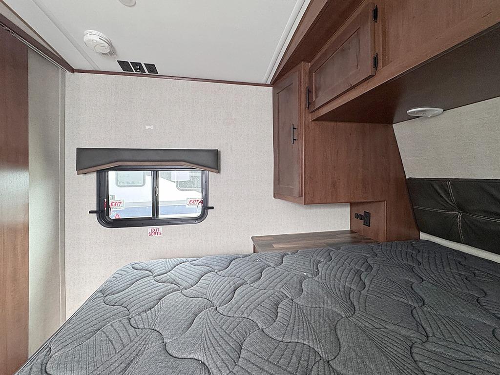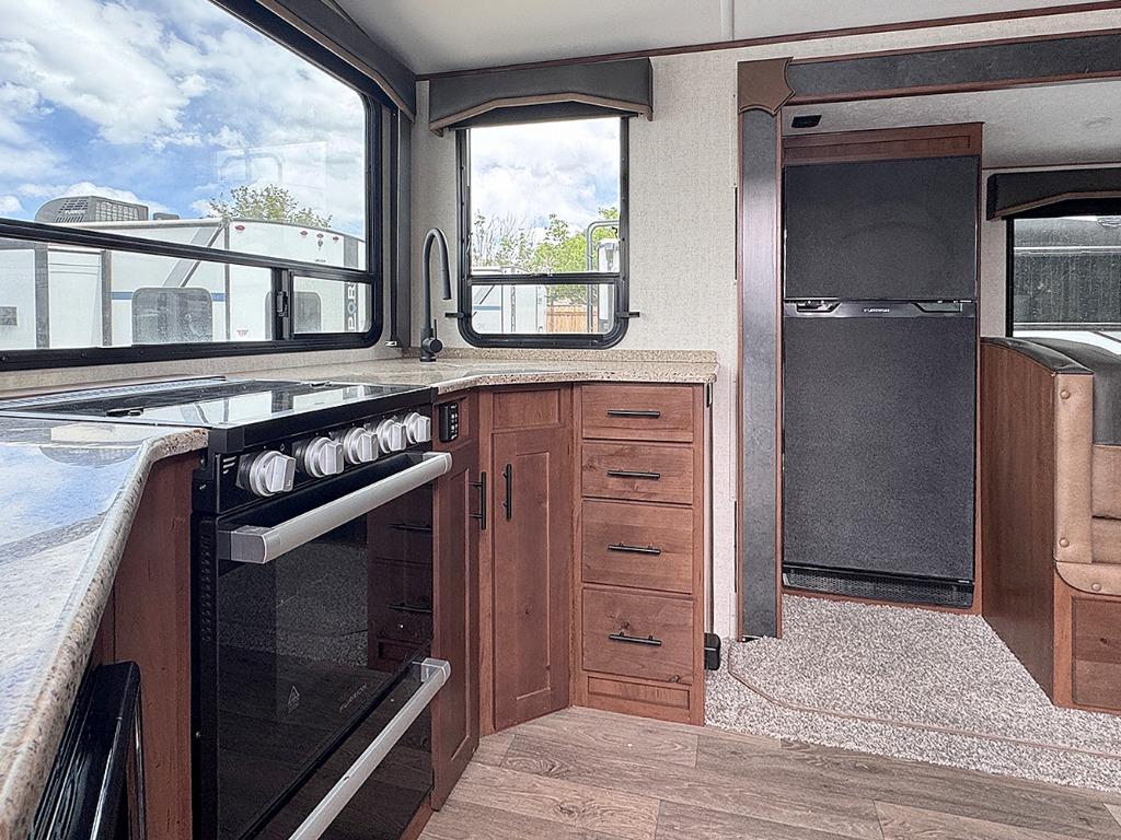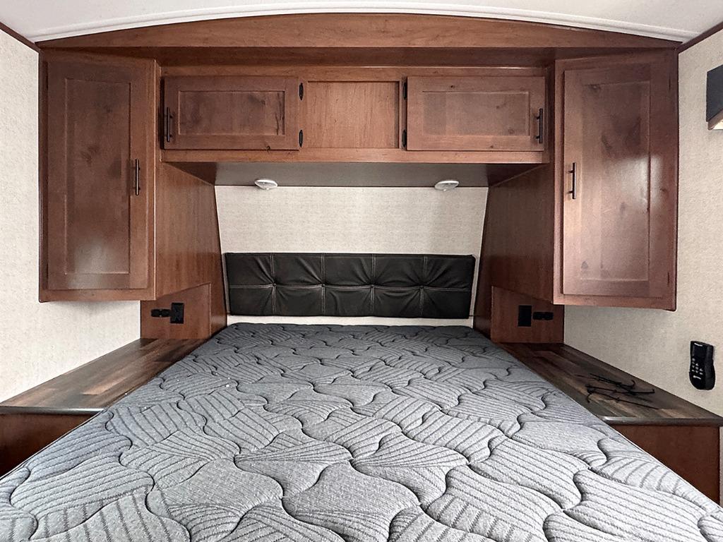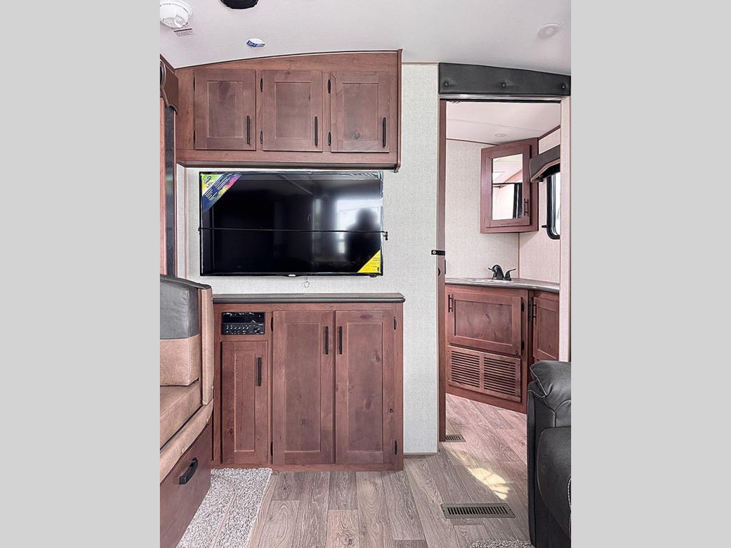 Pack your bags and escape the city life for weekend camping trips in this dual entry travel trailer. When you arrive at the campsite, take a hike to stretch your legs, then come back to prepare lunch on the three burner cooktop. You'll find plenty of counter space in the kitchen, plus a refrigerator for cold drinks and perishables. The dual lounge chairs will have you feeling right at home, or you can choose the optional sofa with built-in recliners, or the optional sleeper sofa if you need more sleeping space. This model includes a walk-through bath that is both spacious and convenient since it leads to to the front master bedroom. You can't beat a queen bed, dual bedroom wardrobes, and your own exterior entry door!