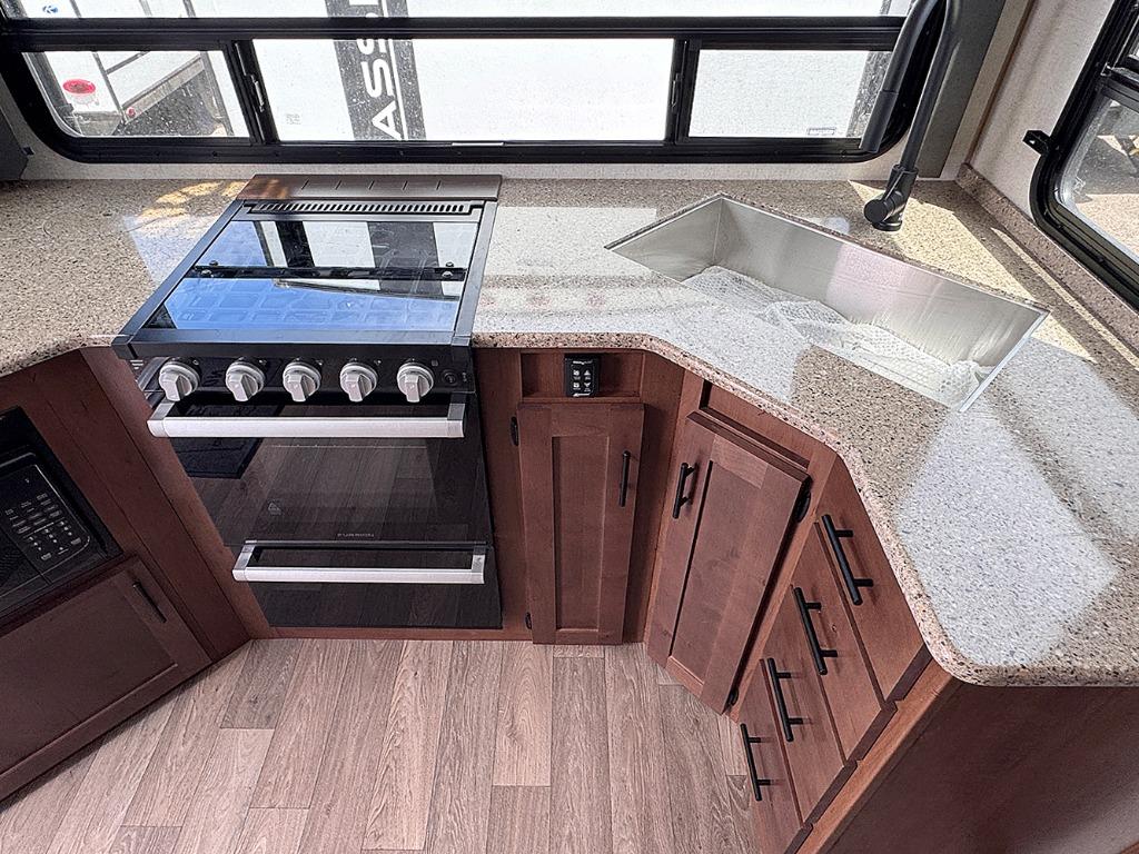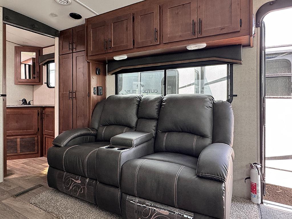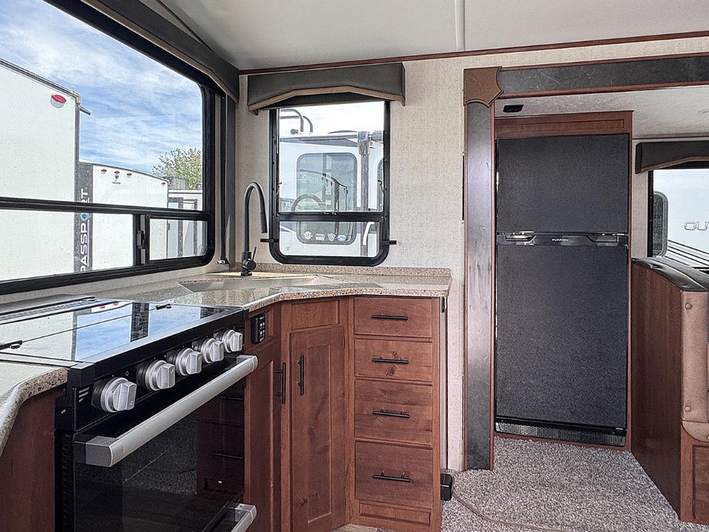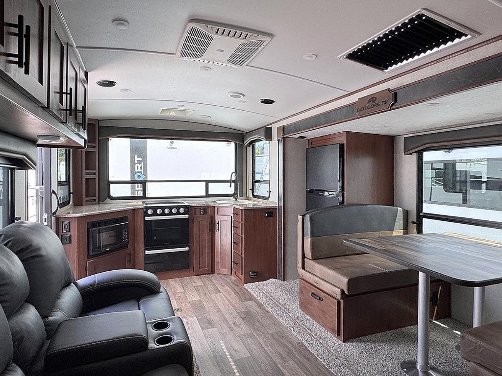 With any Timber Ridge Mountain Series travel trailer by Outdoors RV you will enjoy climate designed four seasons camping thanks to the thermal pane windows and the fully enclosed, heated, and insulated underbelly. The custom built chassis and rugged integrated A-frame are built for strength and durability, along with the rugged 2" bonded aluminum frame walls. Each model includes LG solid surface countertops, granite designed backsplash, vaulted radius ceilings, and a mountain comfort premium mattress for all-around comfort. You will also love the XL panoramic slide out windows and the dual pane living room skylight with a shade to let natural light in!
