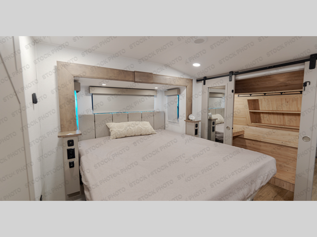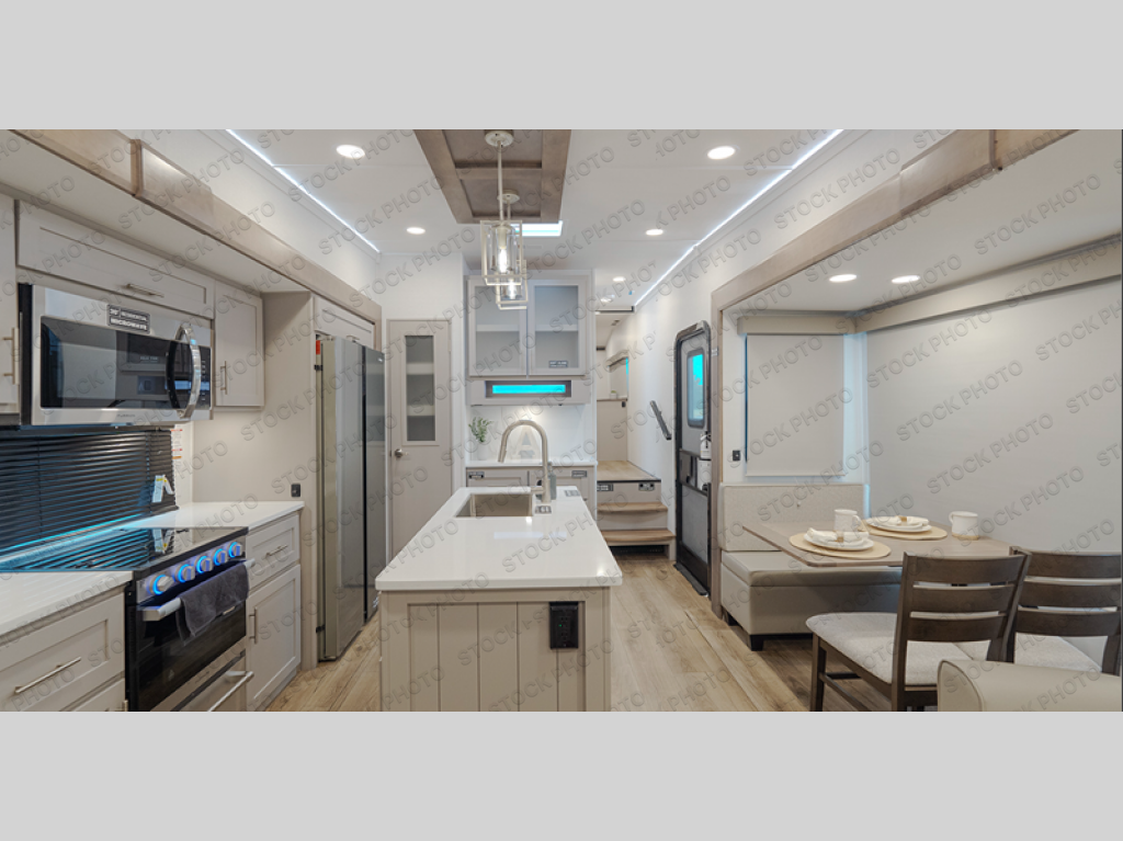 A kitchen island with countertop space makes it easy to prepare meals in this fifth wheel! The floating dinette table has two chairs on one side and a movable ottoman with flip up storage on the other side to keep your games or extra table cloths in. You can store your dishes and snacks inside the hutch/pantry or in the second pantry. The front private bedroom has a queen bed slide but can be switched out for the optional king bed if you like. There is also a dresser and large wardrobe for storage, and either side of the wardrobe with washer and dryer prep. The rear living area features a dual recliner theater seat across from an entertainment center with a 50" class HDTV with hidden storage behind it, and is also on a swing mount for all to see even at the rear sleeper sofa!