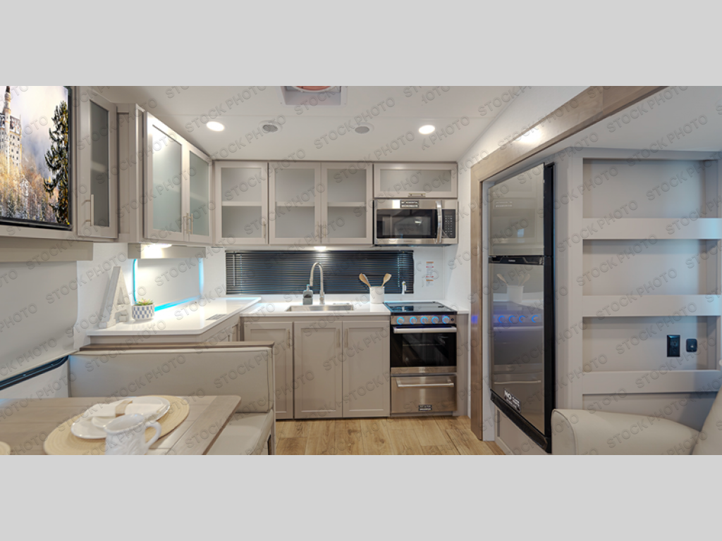 This fifth wheel is ready for adventure when you are! Once you arrive at the campground, you can put out the 16' awning, then start lunch on the exterior griddle. A booth dinette and theater sofa provide seating space inside, and there is a 50" Class HDTV to enjoy movies. The chef will also love the interior kitchen with its ample counter space, and there is plenty of storage with a hutch/pantry, second pantry, and 10 cu. ft. 12V refrigerator. Freshen up in the full bath before heading off to bed in the front private bedroom. Here, you'll find a queen bed, dual nightstands and overhead storage, plus a wardrobe with washer and dryer prep if you choose to add those appliances!