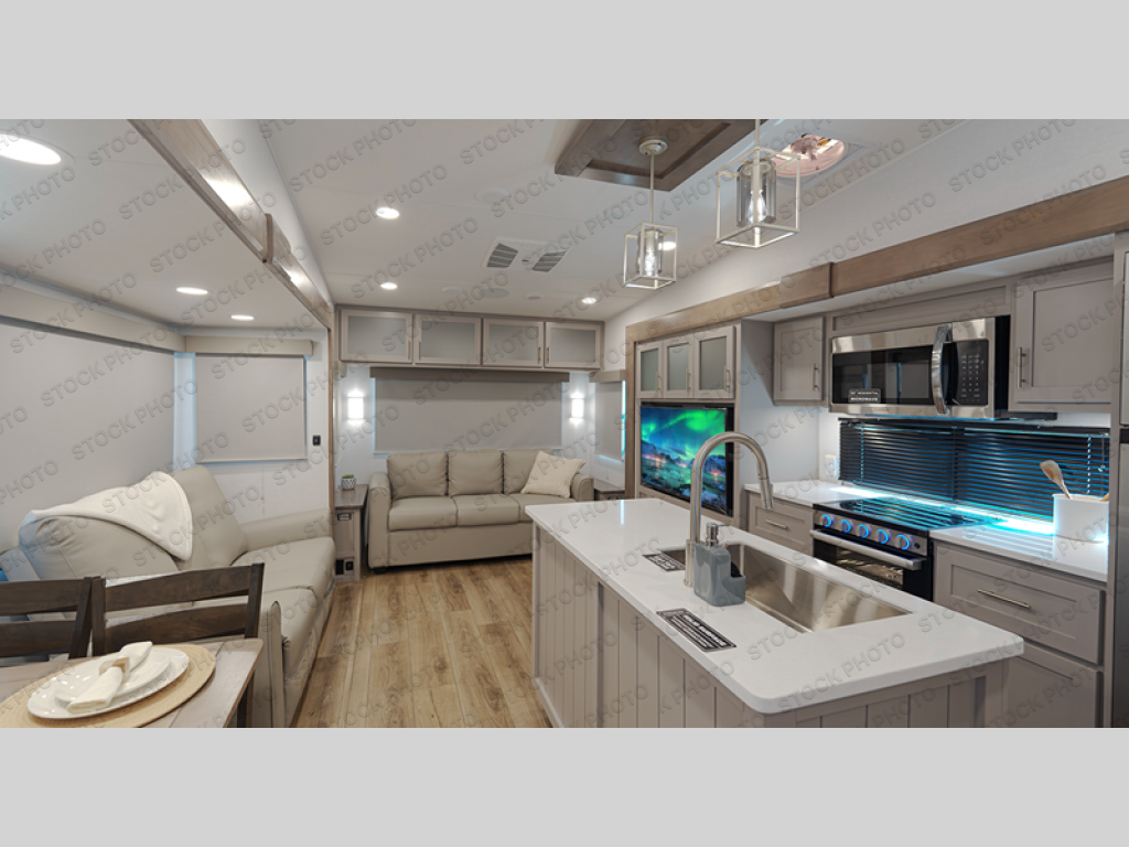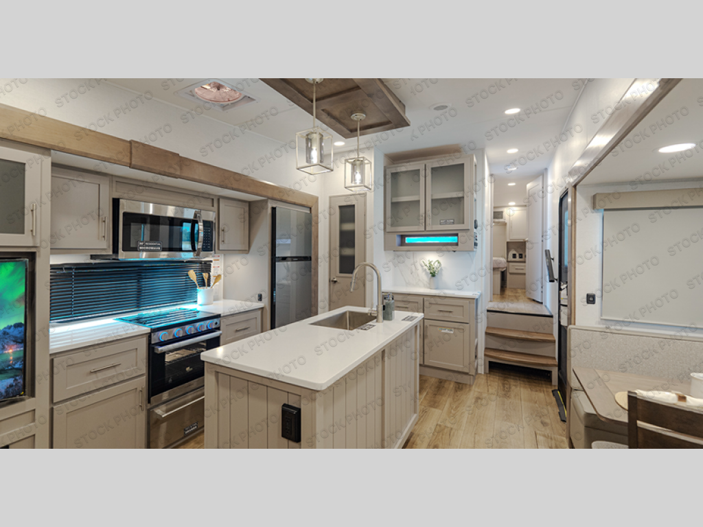 A benchmark chassis creates a space saver upper deck with each one of these Avenue All-Access fifth wheels by Alliance RV! The 101 in. wide-body construction gives you more room to walk around and the flush slide out floors throughout prevent any tripping. There are Azdel composite sidewalls inside and out, and a seamless fully walkable PVC roof for extreme durability and zero maintenance. You are sure to love no carpet throughout making each Avenue All-Access easy to clean and allergen free, not to mention pet friendly. You can maximize your space throughout with innovative storage solutions like the hidden storage behind the TV, inside the end tables, ottoman, and dinette chairs. These units also include the OTG Solar Package with a 200 watt solar panel, 15 amp MPPT charger, multiple outlets, and more to keep you powered up!