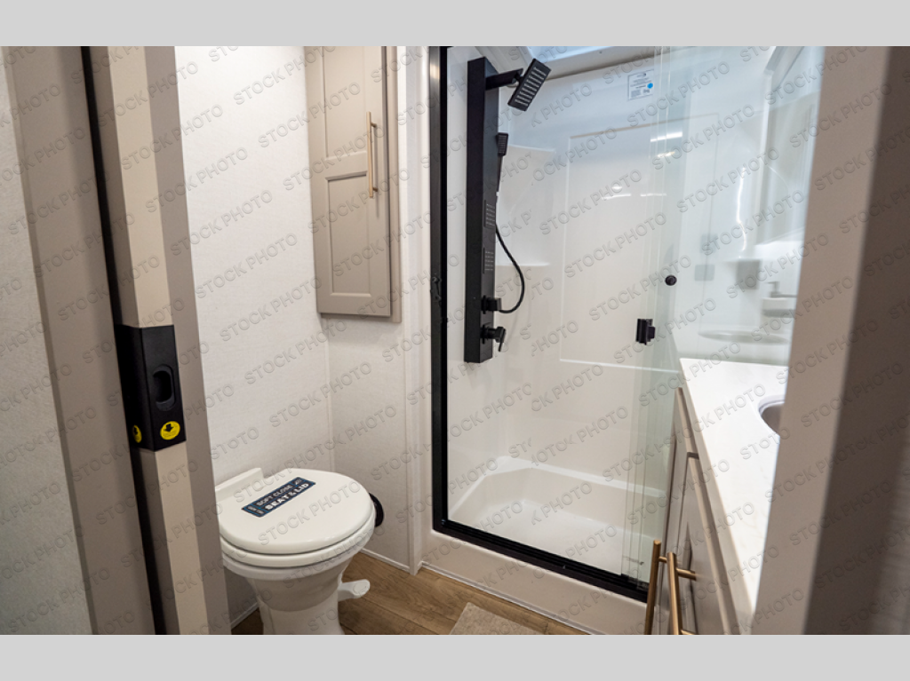 Escape the ordinary and experience the ultimate in luxury travel with this stunning fifth wheel! The rear kitchen is the heart of this fifth wheel, featuring a spacious pantry, 12V refrigerator, microwave, and overhead cabinets. Prepare delicious meals with ease and enjoy the convenience of a fully-equipped kitchen. Unwind in the spacious living area, featuring a plush trifold sofa, L-shape sofa, and a dual recliner love seat. Gather around the turntable dinette or relax in front of the stunning 65” TV. The full bathroom provides a serene space for personal care, while the front bedroom is a peaceful retreat with a comfortable queen bed and a flip-top dresser. Enjoy your favorite shows on the smart TV, perfect for relaxing after a day of adventure.