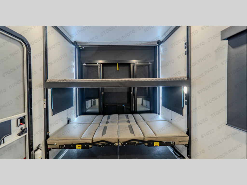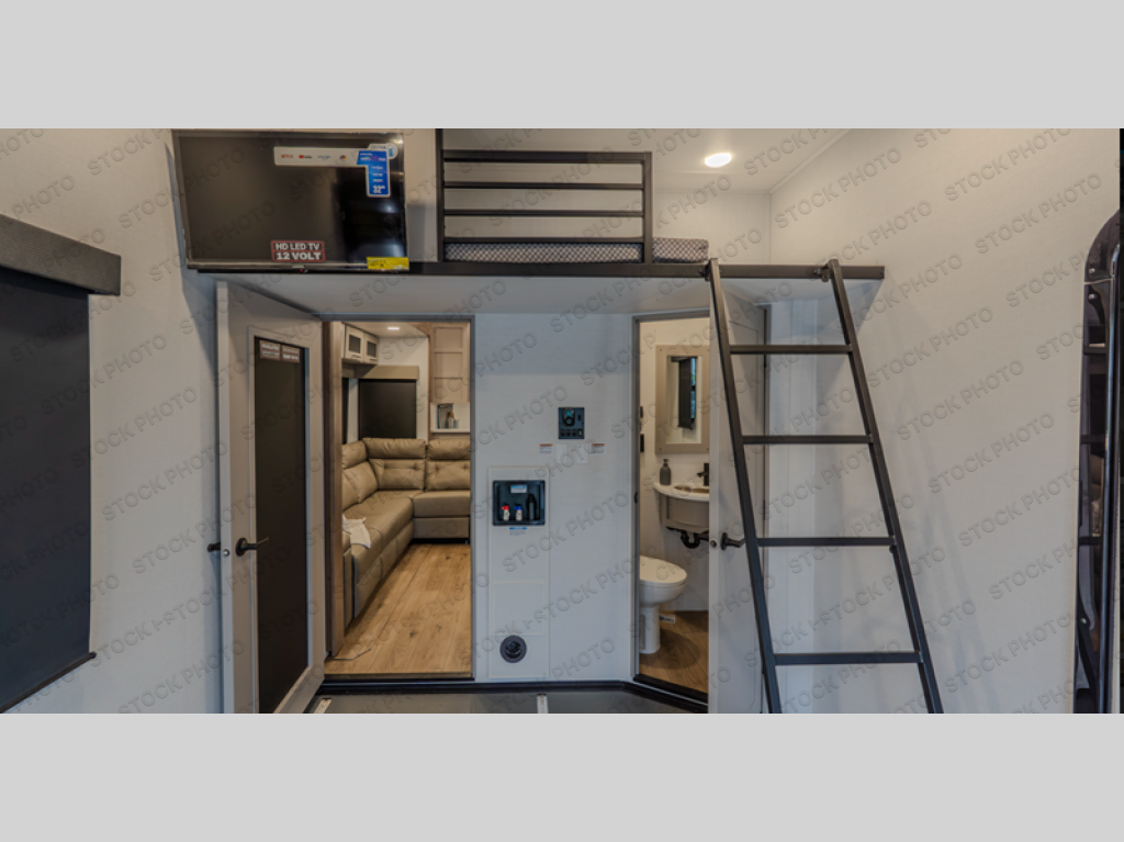 The whole gang will love camping in this toy hauler with a 14' garage for your toys and gear. Once you have arrived at your destination, you can set up the HappiJac roll-over sofas with a queen bed above them, and also a loft which opens to the garage area as well. A half bath is also available off the garage which is an added convenience for those sleeping in this converted area, and for those coming in off the trail so that they do not have to track all through the main unit to use the bathroom. The chef can prepare great meals for their hungry crew with the fully equipped kitchen including a four-burner cooktop, a 12V refrigerator, large sink, and plenty of countertop prep space. The rest of the gang can be relaxing on the large L-shaped sofa slide watching the 50" HDTV and enjoying the fireplace or playing a game of cards at the dining table with four chairs. The front private bedroom features a king bed slide for more interior space, a flip top dresser for all of your belongings, and a front wardrobe with washer and dryer prep, plus it has an entrance into the dual entry bathroom!