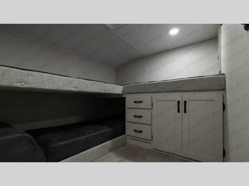 You'll love the amount of space you'll have in this fifth wheel thanks to the double slides! Once you arrive at the campground, you can start lunch in the full kitchen, then dine at the J-lounge with a table and bench seat. There is also theater seating within the living room slide for added space and comfort. Your guests can claim the front bunkhouse to themselves, which includes two bunk beds with a wardrobe below for clothes and shoes. The rear master bedroom will have you feeling right at home with a queen bed slide out and quick access into the full bath!
