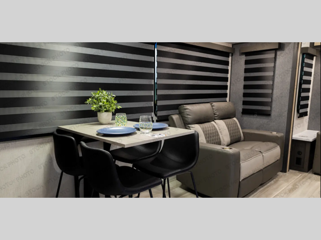 Imagine waking up every morning in a luxurious RV that feels like home. The rear living room is a cozy retreat, perfect for relaxing and unwinding after a long adventure day. With a comfortable hide-a-bed sofa, entertainment center, cozy fireplace, theater seating, and overhead cabinets, you'll have everything you need to enjoy quality time with family and friends. The kitchen is perfect for fulfilling all your cooking cravings, featuring a kitchen island with flip-up extension for added convenience when cooking, a microwave, pantry, and 12V refrigerator. There is also a hi-top table and chairs, coffee bar, and walk-in pantry. The full bathroom comes with a linen closet and all the amenities you need to freshen up and feel at home. And with a spacious shower and plenty of storage, you'll have everything you need to start your day off right. The front bedroom is the perfect space to recharge energy, featuring a comfortable king bed, dresser, walk-in wardrobe, and washer and dryer prep for all your laundry needs. Outside, you'll appreciate the pass-through storage for all your gear and toys, as well as the 15' and 11' awnings for shade and protection.