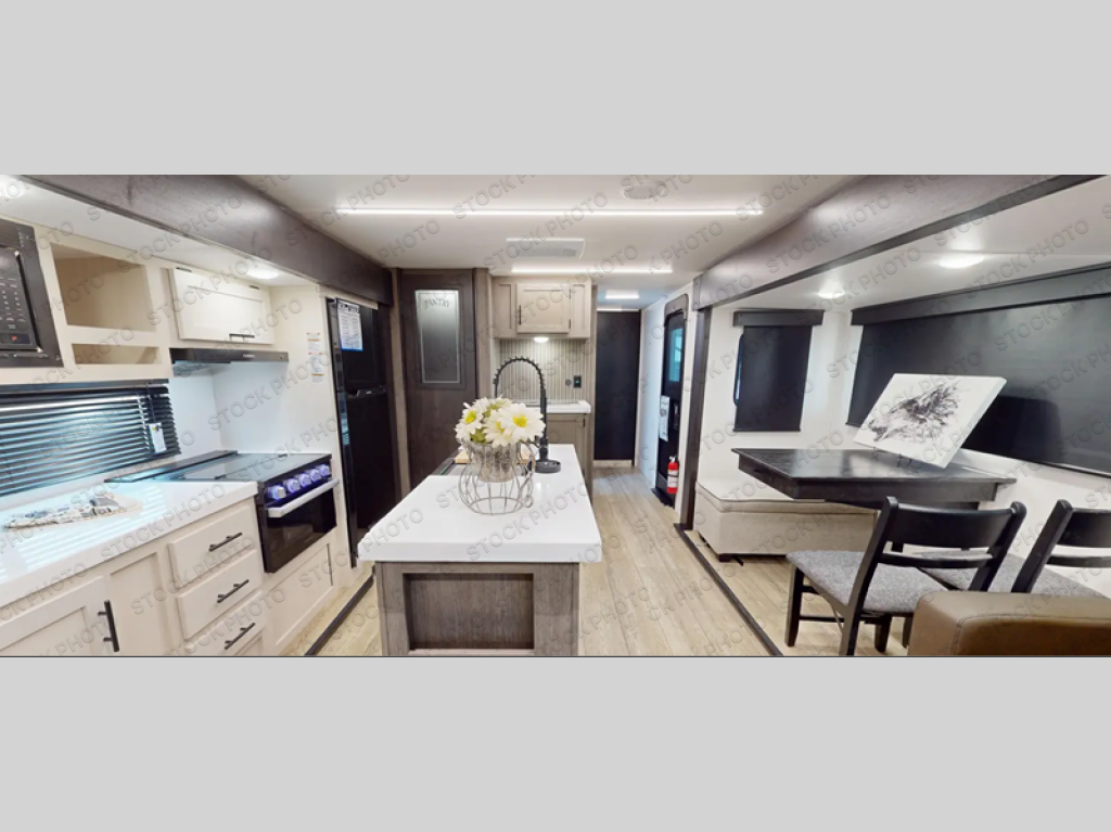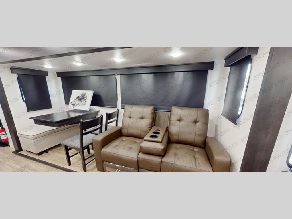 This trailer has it all for maximum comfort and convenience as well as entertainment! The rear living area includes a tri-fold sofa with a rear Pano-Vision window for great views of your campsite, and dual opposing slides widen this area so you can visit with friends. You'll also find theater seating, plus a free-standing table with two chairs and a storage ottoman seat. Enjoy the fireplace on a cool night or when you want a little ambiance while seated inside. Two patio awnings will provide an outdoor living area; just grab your camping chairs from the full pass-through storage. When you want to call it a night, fall quickly to sleep on the queen bed in the front bedroom with easy access to a dual entry bathroom!