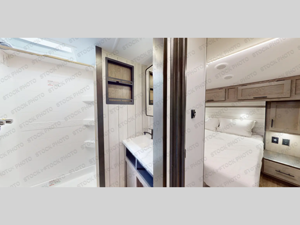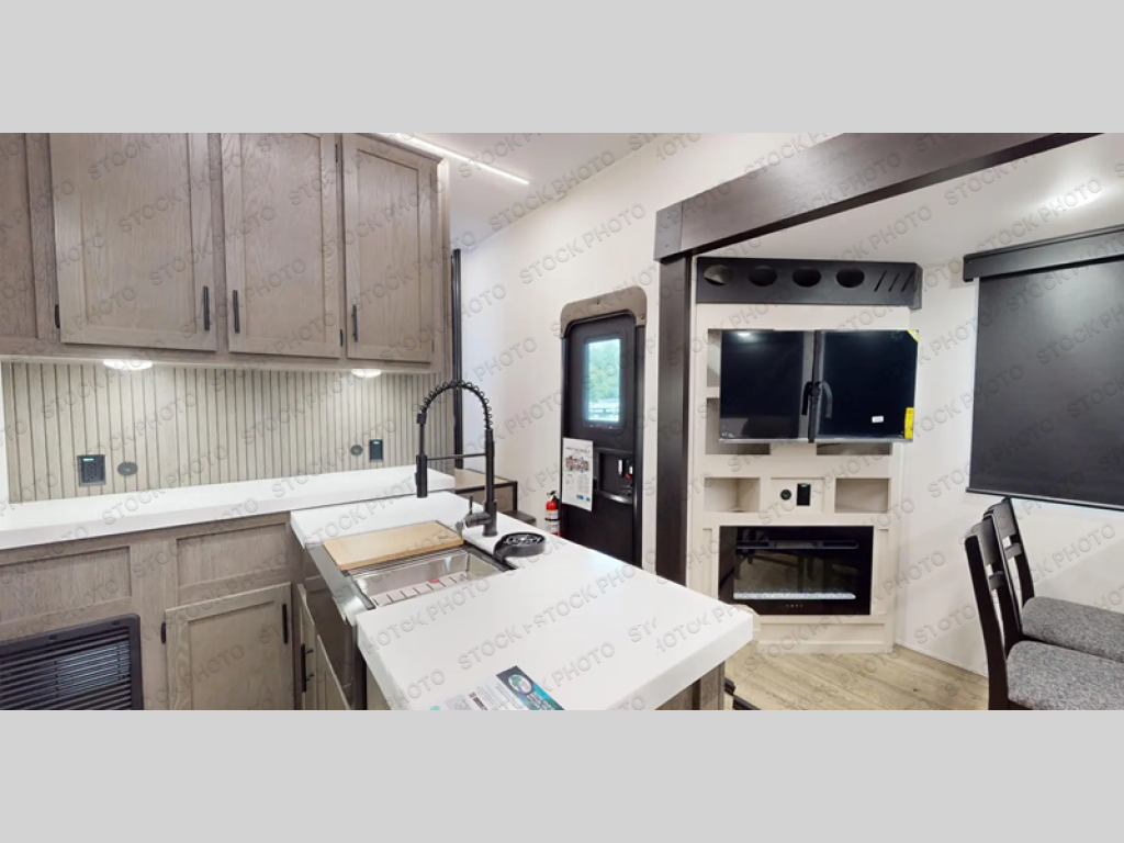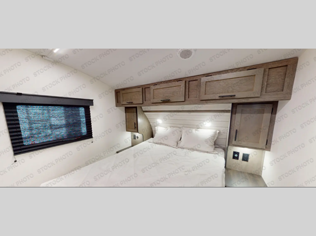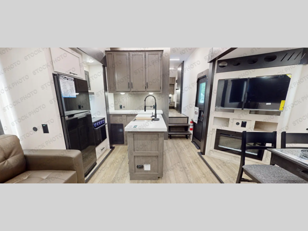 This fifth wheel is perfect for couple's but also has enough space for company too! The rear living area features two recliners with a middle table side to set your cup of coffee, a tri-fold sofa that can transform into an extra sleeping space, and free standing table with chairs and storage ottoman seat to enjoy your meals by the electric fireplace. The fully equipped kitchen has everything you need including a counter peninsula, 12V refrigerator, and plenty of storage. After a fun-filled day at the beach, rinse off in the full bathroom that includes a spacious shower, porcelain toilet, and convenient shower caddy. The front private bedroom has a queen bed to lay your head on at night and there is even USB ports on either side to charge your electronics!