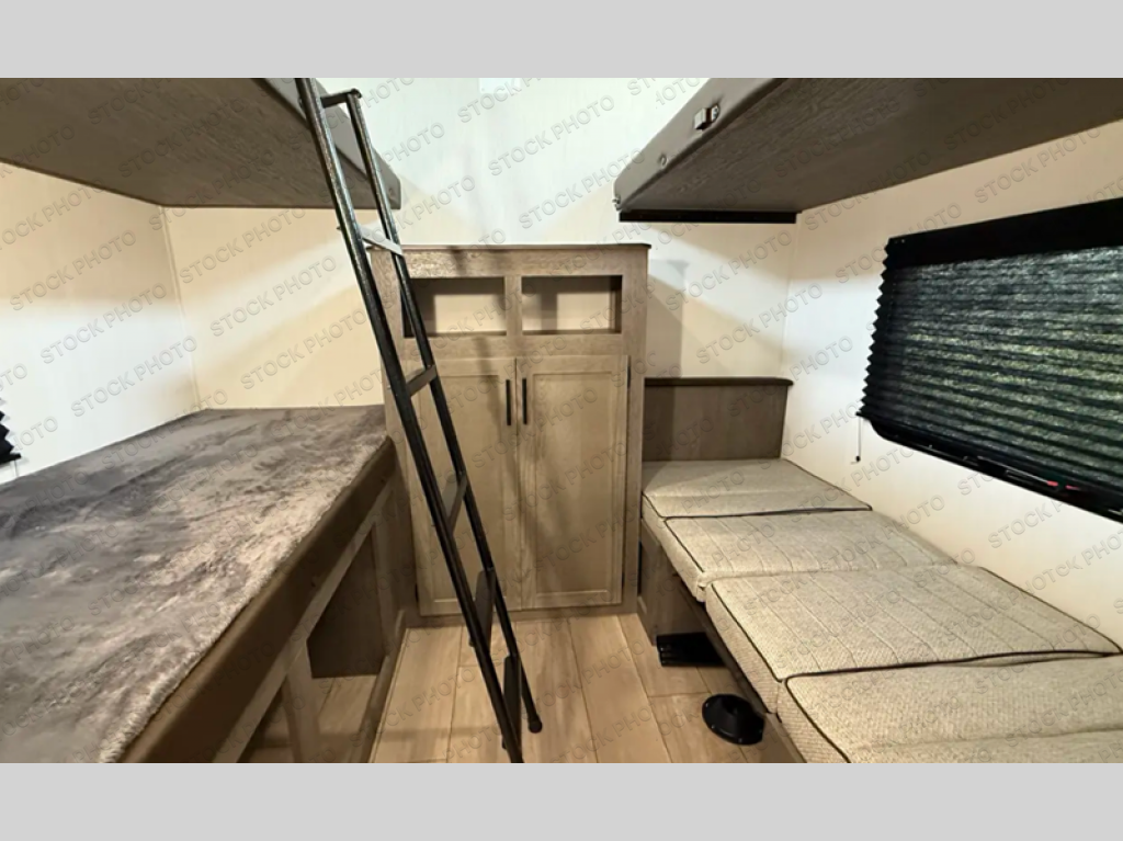 Invite the whole gang with this spacious fifth wheel in tow! The rear private bunkhouse includes triple bunks, a dinette, plus a TV stand with a dresser to keep your space tidy. You'll find a queen bed in the front private bedroom, along with two wardrobes and an overhead cabinet for books. Everyone can meet in the combined kitchen and living area to relax on the tri-fold sofa, play a game around the U-shaped dinette, or just enjoy the fireplace! The chef of your group will have an interior kitchen to cook meals each day, or they can head outside to use the outdoor kitchen with a refrigerator. There is also a 20' patio awning and outside storage to keep hiking gear packed away.
