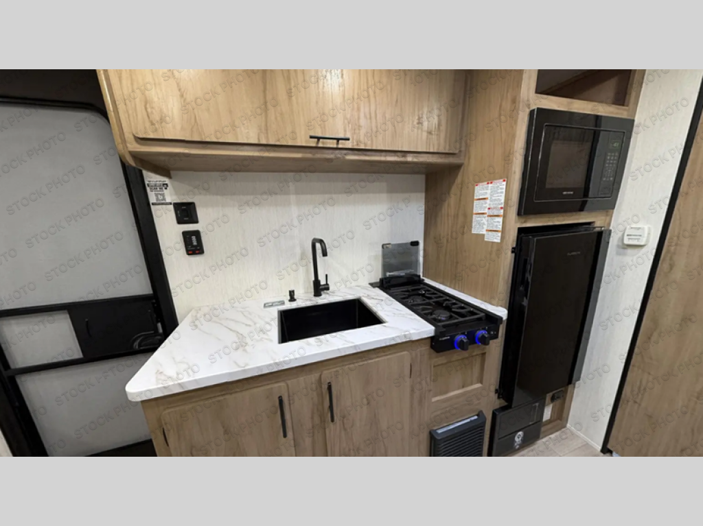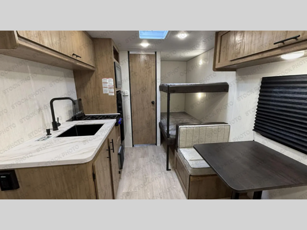 The whole family can sleep comfortably in this travel trailer! It has a set of bunk beds for the kids to sleep on, and you can sleep comfortably on the front queen bed with overhead cabinets and a shelf. The chef will enjoy preparing their best home cooked meals with the high output cooktop, and you can dine at the booth dinette. And the private bath onboard means you won't have to leave your camper in the middle of the night!