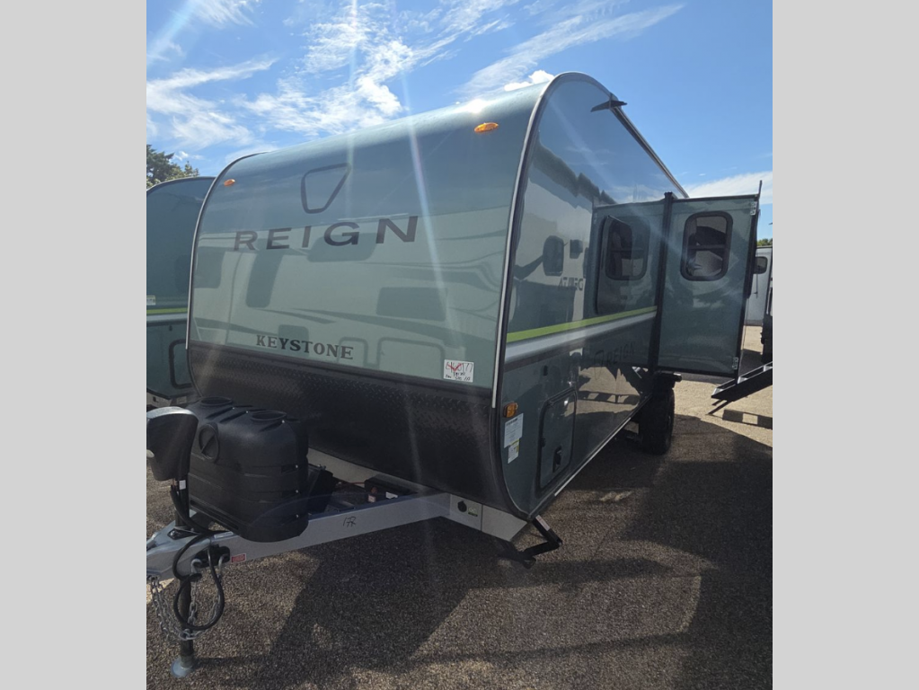 The Reign travel trailers by Keystone are premium single-axle units that are sure to make an impression at the campground. Each one is built with an exclusive automotive-finished aluminum exterior, a walkable roof, and a 100% composite floor for added durability. There are also tinted safety glass windows, quick drop stabilizer jacks, and an exterior shower with hot and cold water. The European inspired interior design is unique and cozy, and the 78" interior height will give you plenty of space to move about. You will also enjoy the ultra bright LED light strip and solid surface countertops in the kitchen, along with blackout night shades, and many more interior comforts.