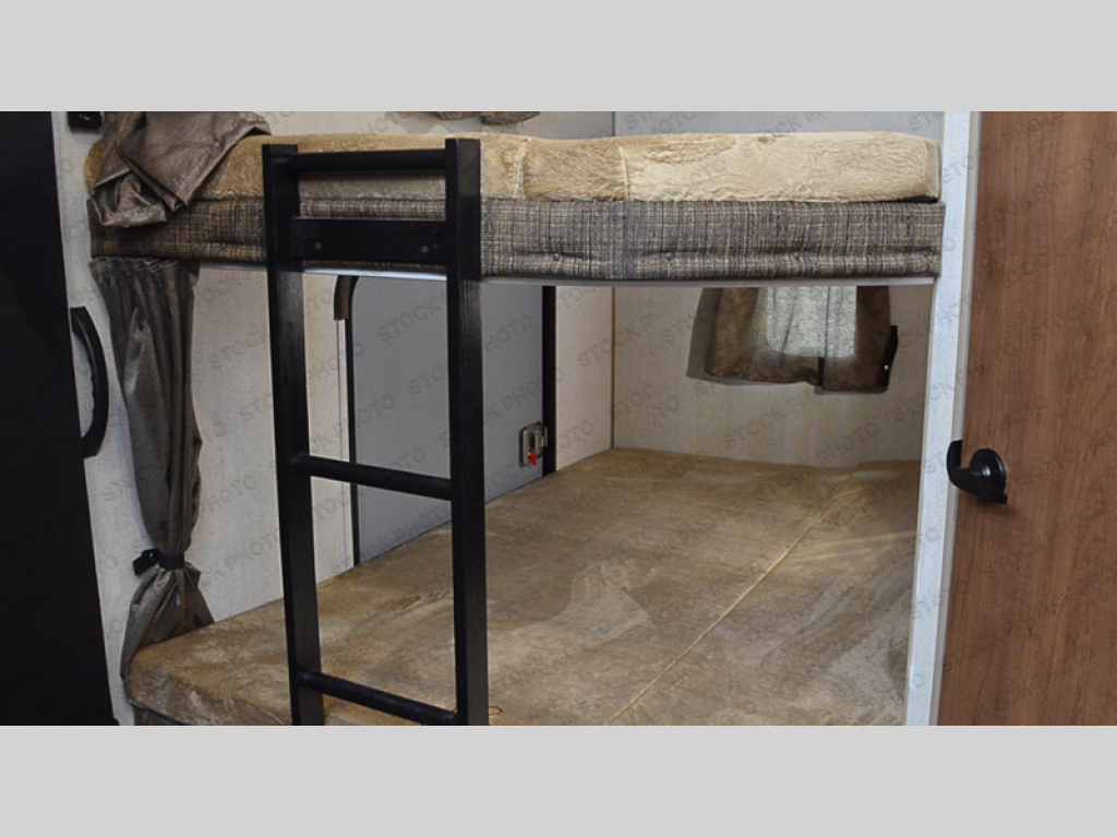 How does double-size bunks sound for your next camping trip? The kids or your guests are sure to love them, while you enjoy the queen bed in the front bedroom. There is a garage storage door that will be perfect for luggage, lawn chairs, and coolers, plus there is plenty of storage inside as well. The chef of your group will love cooking in the kitchen with its flip-up counter, three burner cooktop, and skylight for natural light. The mountain dinette slide in the main living area will provide space to let the dog rest on the floor, and there is a 40" TV for movie night!