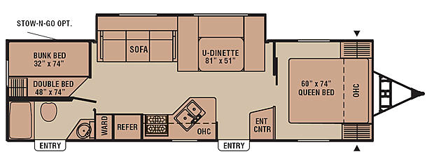 Single Slide, Rear Corner Bath w/Lav., Tub/Shower, Separate Entrance, Rear Corner Bunks w/Lower Double Bed, Sofa & U-Dinette Slideout, Ent. Center, Front Queen Bed, Overhead Cabinets, Front Exterior Storage and More.