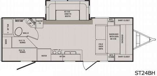 Single Slide Sunset Trail Bunkhouse Travel Trailer w/Rear Corner Bat Including Sink, Tub & Toilet, Rear Corner Bunks w/Lower Double Bed, Wardrobe, Pantry/TV, Refrigerator, Furnace, 3 Burner Range, Double Kitchen Sink, Overhead Cabinet, U-Shaped Booth Dinette, Front Queen Bed w/Fold Over Sofa at Foot of Bed, Nightstands, Shirt Closets and More!