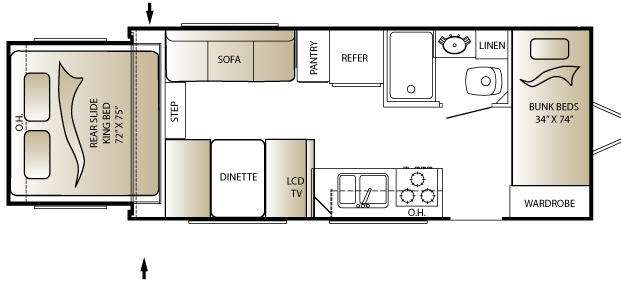 Outback Bunkhouse Travel Trailer w/Rear Slideout King Bed, Sofa, Booth Dinette, Pantry, Refrigerator, Double Kitchen Sink w/Overhead Storage & LCD TV, 3 Burner Range, Front Bunk Beds w/Wardrobe, Tub, Lavatory, Linen Closet, Outside Bicycle Storage and More.