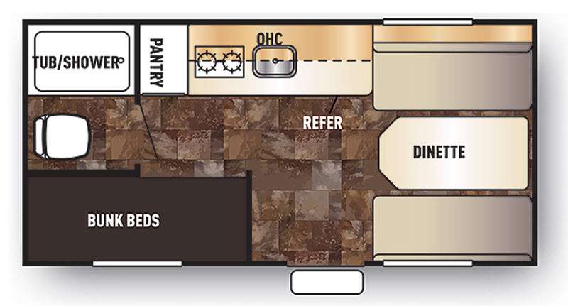 As you enter the travel trailer, you will find a dinette at the front with overhead cabinets on one side. Directly in front of you is a refrigerator, single galley sink, two burner range, pantry and overhead cabinets.