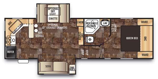 As you enter the fifth wheel, along the rear wall you will find a refrigerator, three burner range, microwave, and large kitchen sink. There are two bar stools next to the counter. The slide offers a dinette and an optional 40" storage drawers and an optional skylight. Next to the slide there is a linen and an entertainment center. The other slide offers a sofa and an end table.