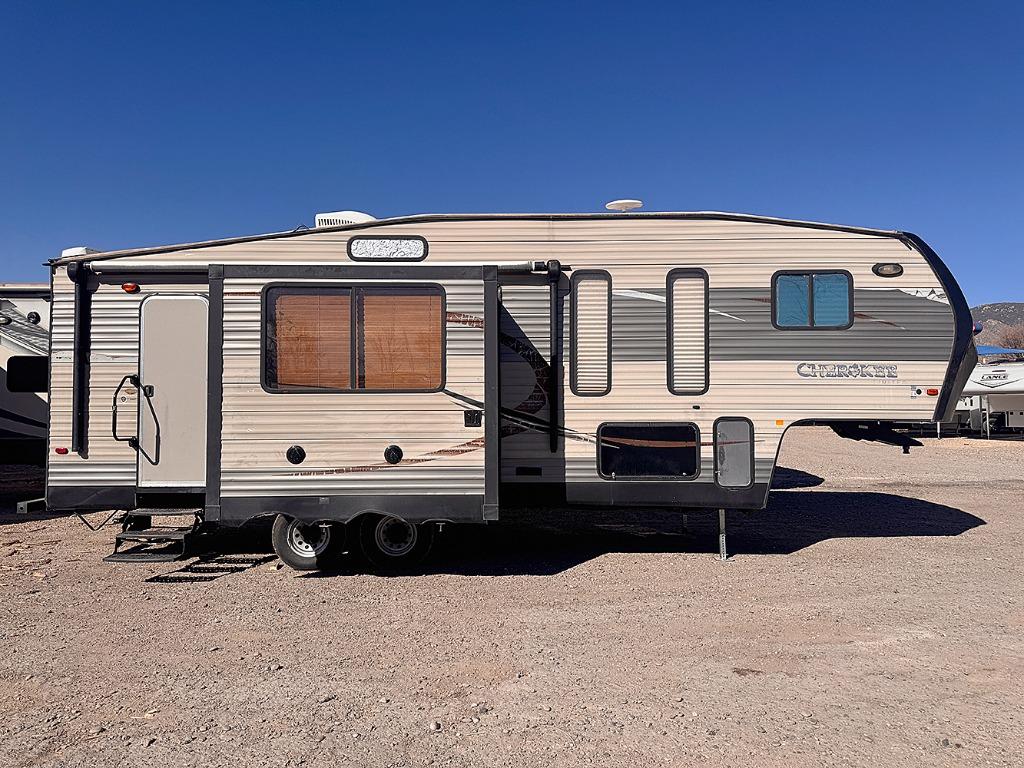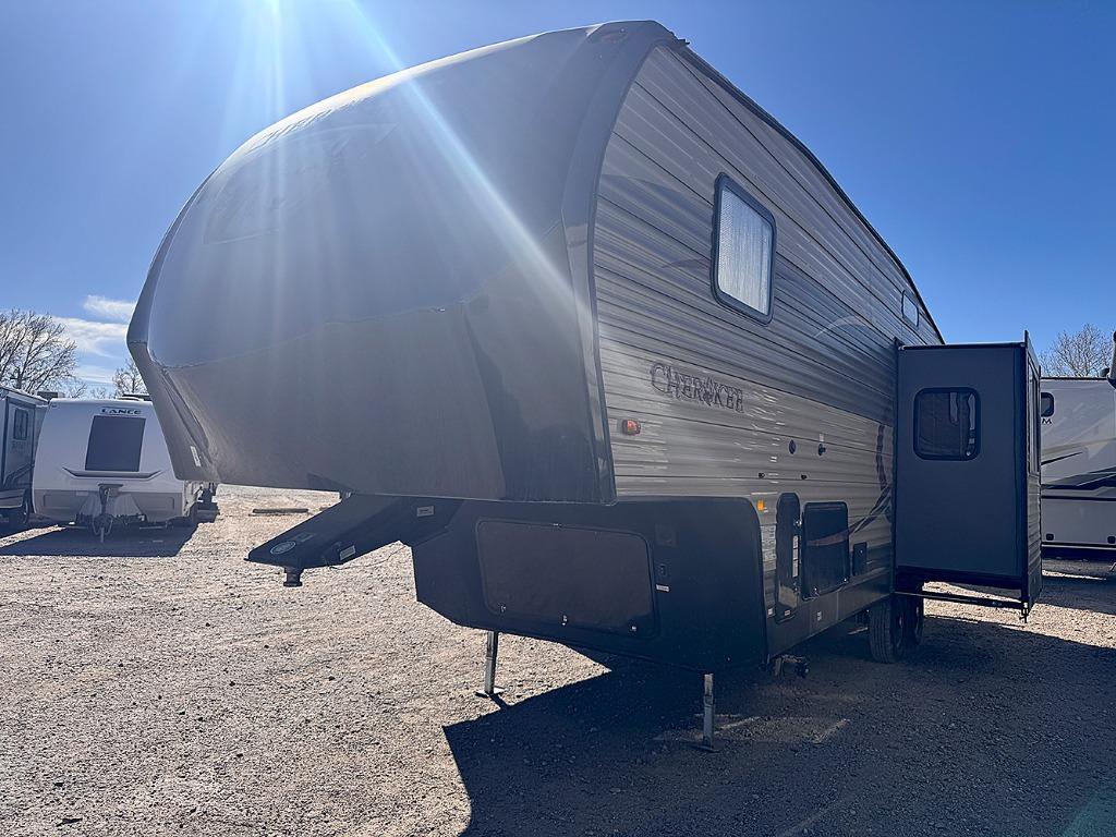 The Cherokee 255P fifth wheel by Forest River offers double slides and a rear kitchen area.